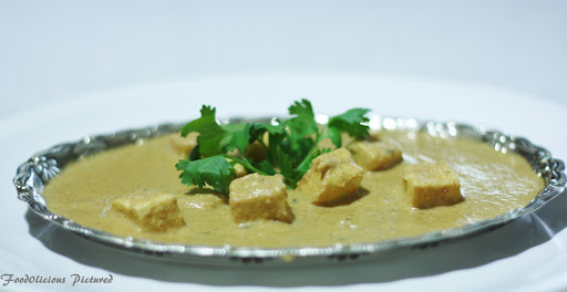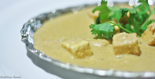 - Add the almond paste, paneer cubes, Salt and ½ cup water. Simmer for 5 minutes or till the gravy thick.