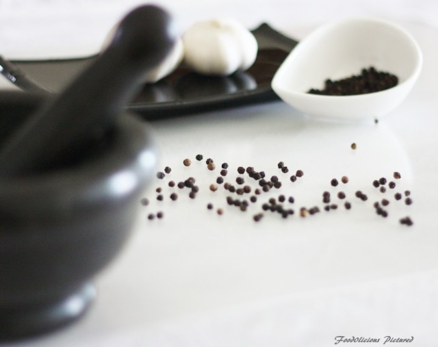 - Crush together whole black pepper, green chili ginger, garlic, coriander leaves and lime juice . Add a little water if required; around 2 teaspoon