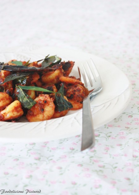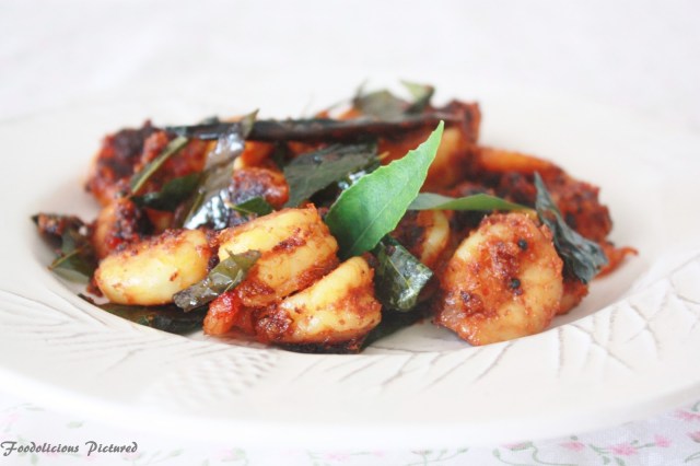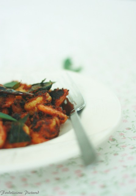 Heat 1 tablespoon of oil in a non-stick pan. Add the mustard seeds, allow it to crackle. Tip in 1 twig of curry leaves and red chili. Add the chopped onion and cook till they are soft. Now add the ground paste, salt and cook till oil starts to separate. Throw in the prawns and mix well. Add the water and cook on a medium heat until almost all the water is absorbed. At this stage the prawns must be coated with the gravy. Drizzle the remaining oil and add the curry leaves. Cook till the prawn start to crisp up. Turn off the heat.