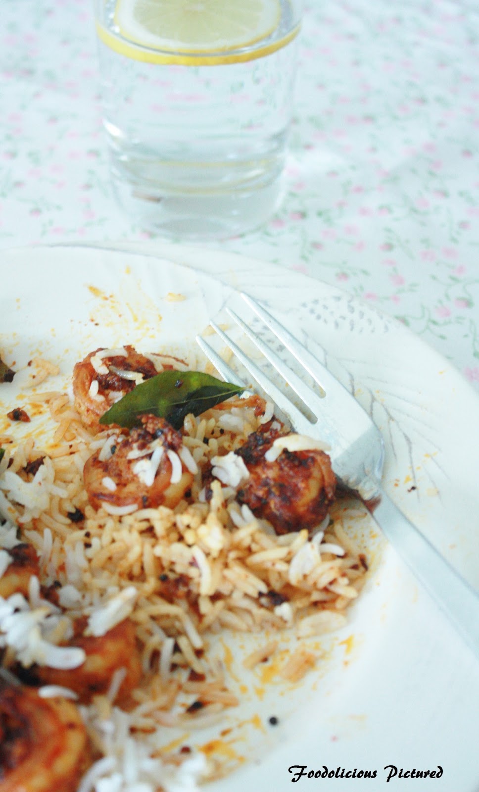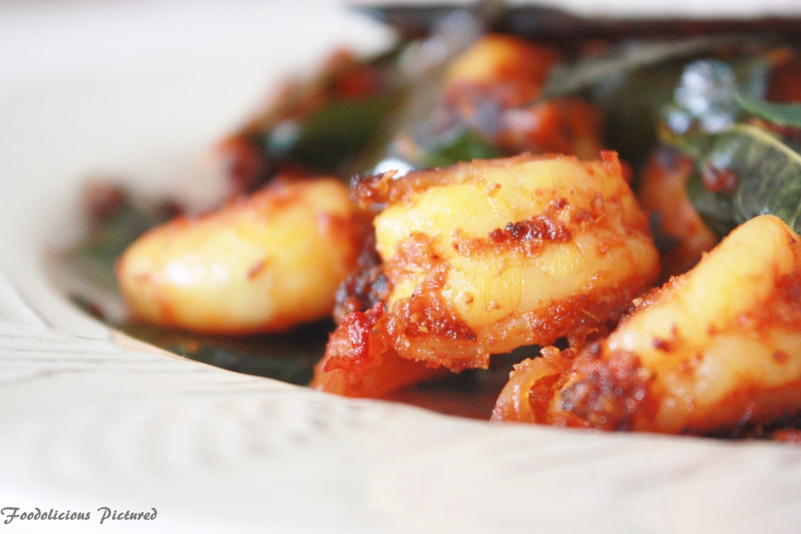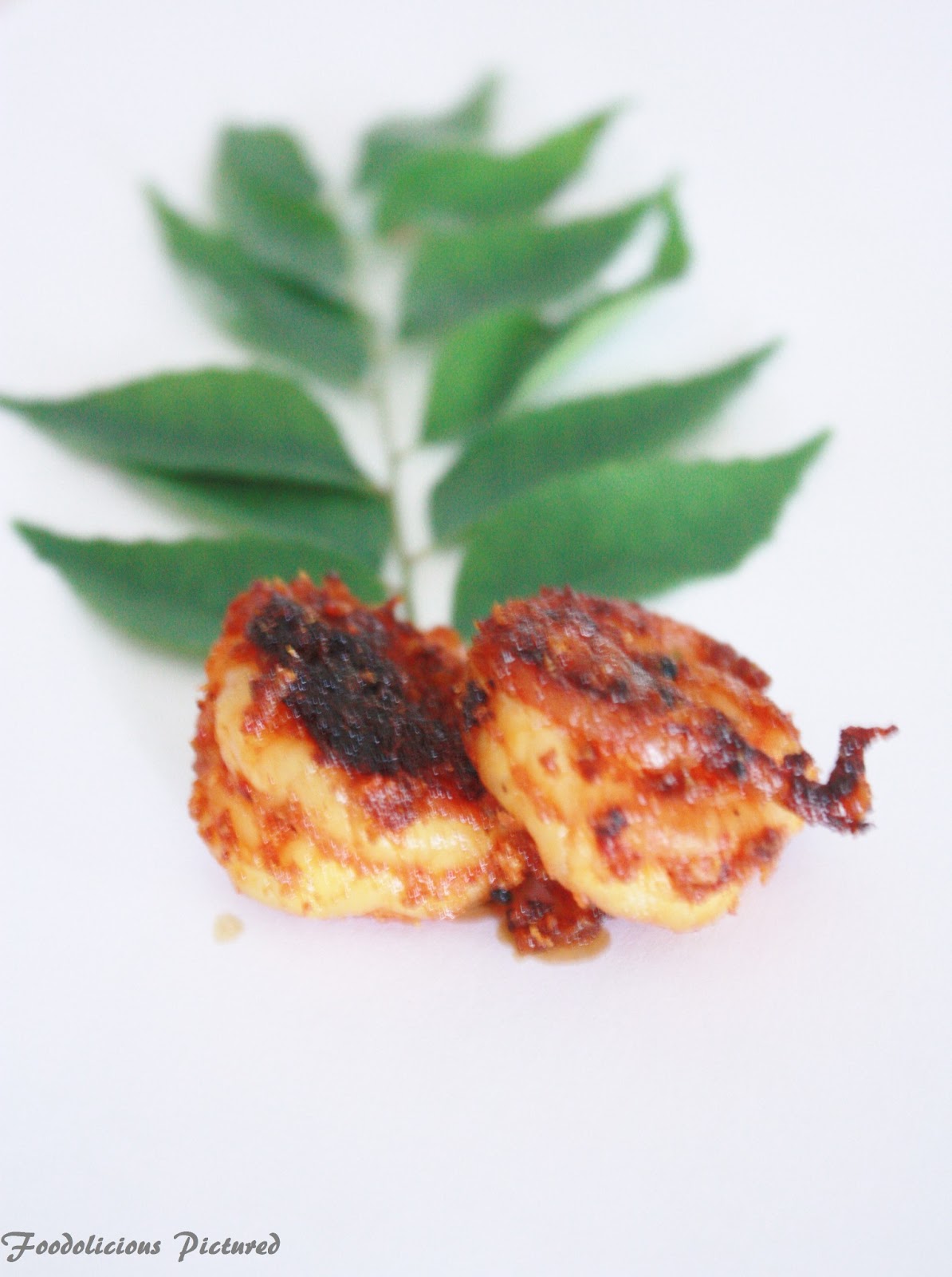 Heat 1 tablespoon of oil in a non-stick pan. Add the mustard seeds, allow it to crackle. Tip in 1 twig of curry leaves and red chili. Add the chopped onion and cook till they are soft. Now add the ground paste, salt and cook till oil starts to separate. Throw in the prawns and mix well. Add the water and cook on a medium heat until almost all the water is absorbed. At this stage the prawns must be coated with the gravy. Drizzle the remaining oil and add the curry leaves. Cook till the prawn start to crisp up. Turn off the heat.