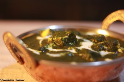 Blanch the spinach in a sauce pot with boiling water for 2 to 3 minutes. Remove and puree the spinach. In a pan heat the oil and fry the paneer pieces until the sides becomes slightly brown. Set aside.