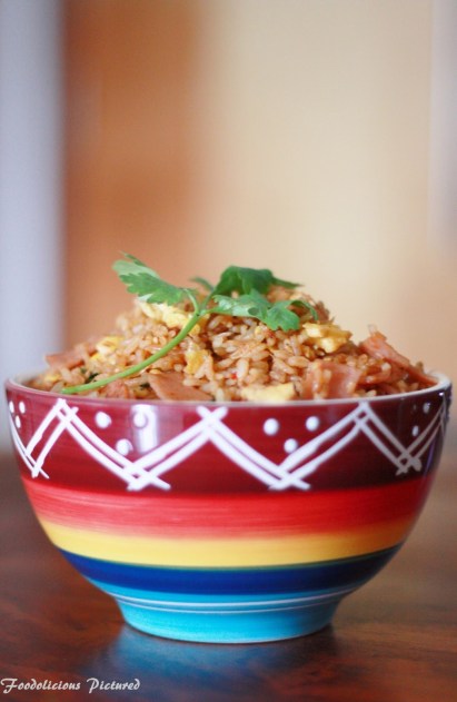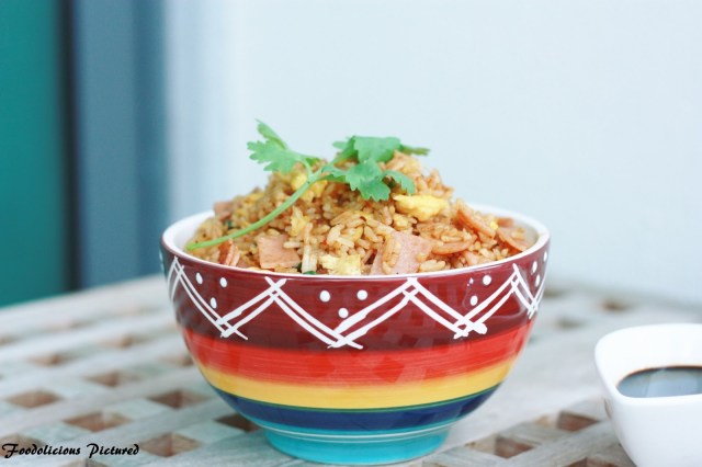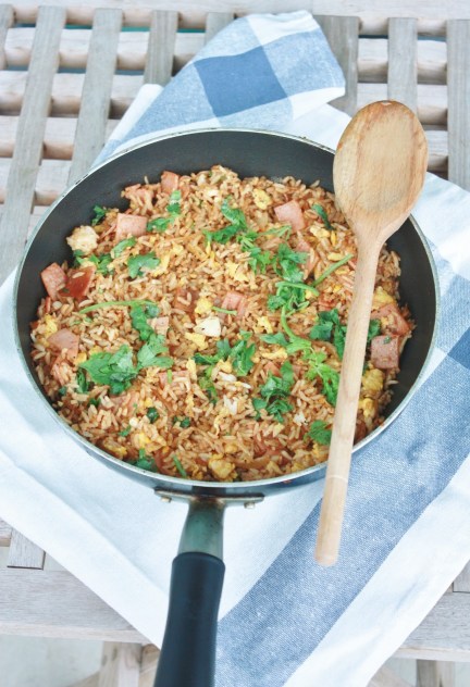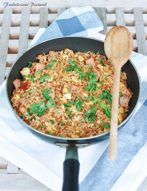 Add the scrambled egg and capsicum; mix well. Increase the heat, add the rice and drizzle the soy. Mix well to coat the rice. Cook for 3-4 minutes stirring continuously.