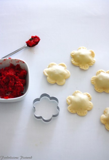Place the pastry sheet on parchment paper and cut into shapes using the cookie cutter. Take a cut pastry, place the beets-potato filling. Place another cut sheet on top and gently press the edges to seal. You can use a fork to press the sides.