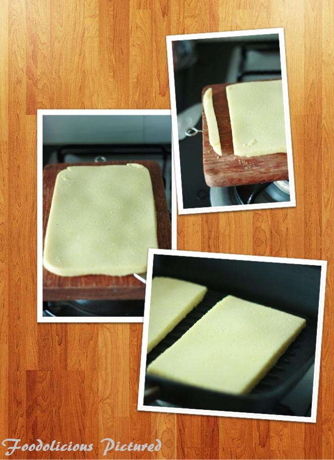 Bring to boil the stock and milk, add the polenta and stir continuously for 2-3 minutes or till creamy. Transfer the polenta into a greased dish and refrigerate till set. Once set, cut the polenta into 2 pieces. Transfer to a baking tray, sprinkle the Parmesan cheese and bake on 250C for 8 minutes or till the cheese has melted and forms light golden crust on top.