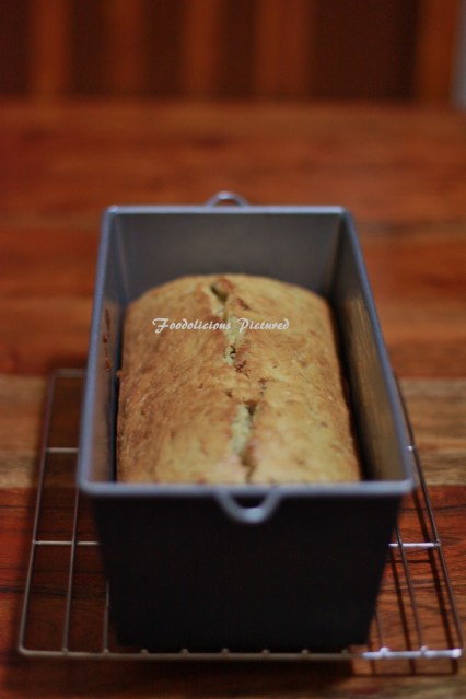 Pour the mixture into the prepared loaf pan and bake for 45 minutes or till the toothpick comes out clean when inserted in the center of the loaf.