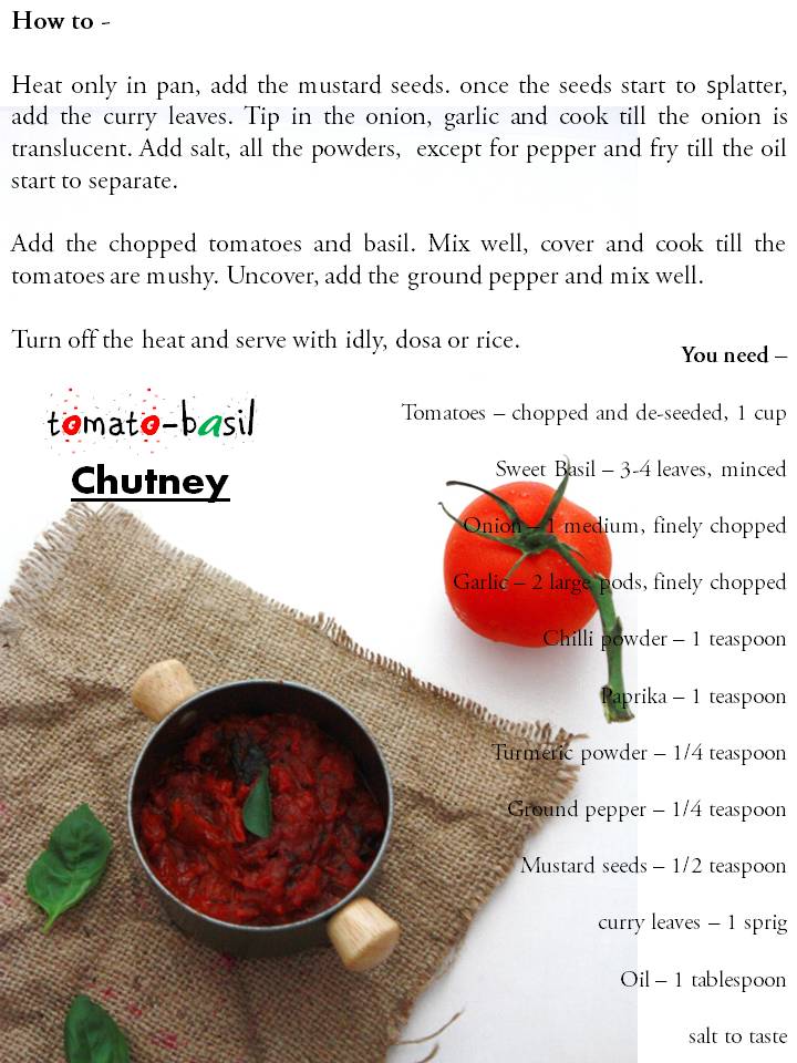 1. No amount of chutneys will satisfy me. Almost everyday I have chutneys or the nearest will be pickles. Interesting to note the use of basil leaves. These are growing in my garden and will make way for the same, the stunning tomato chutneys to be made for my joy at home.