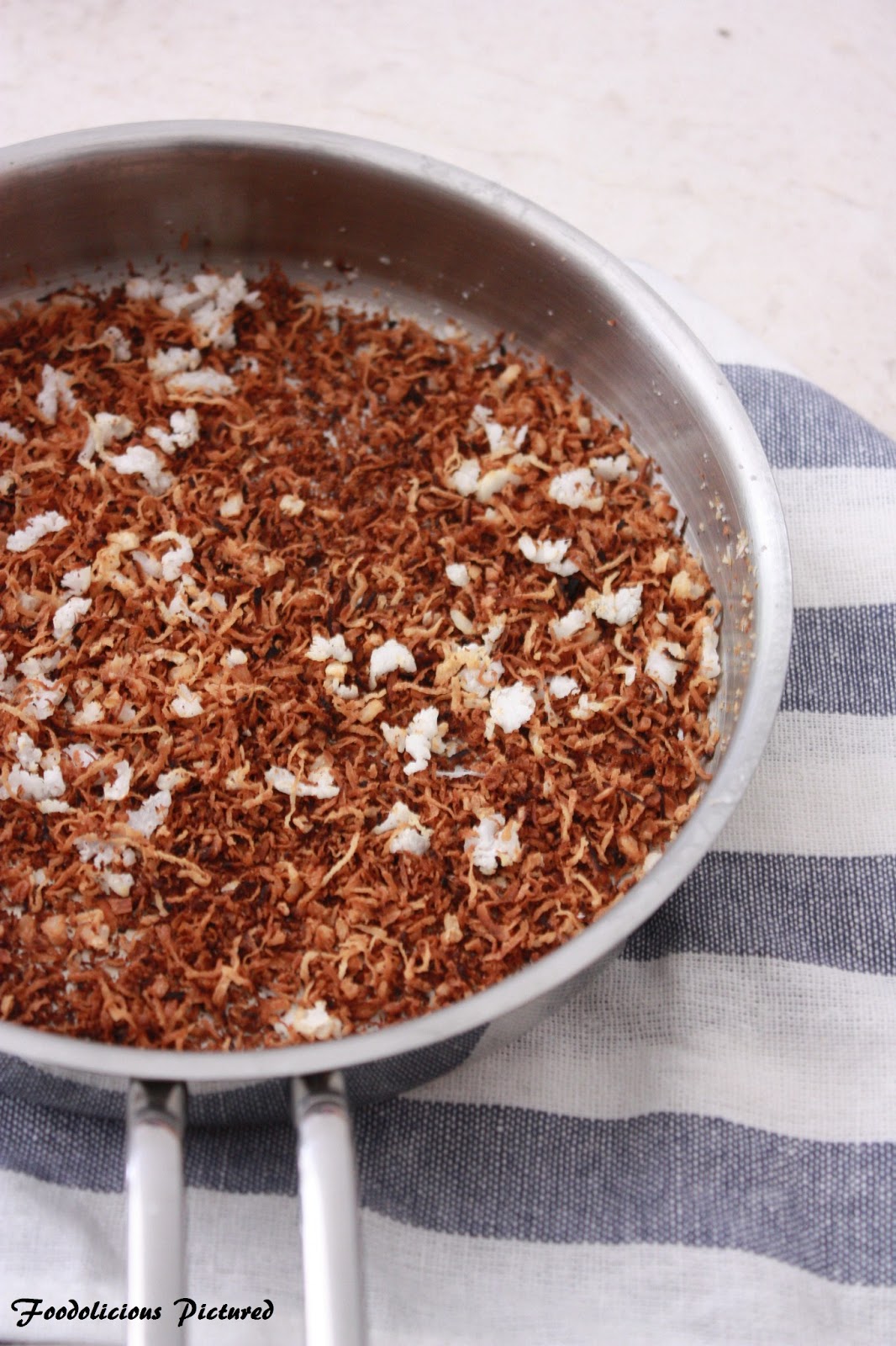 In a pan, dry roast the coconut till they turn brown. Into a blender and blend to a fine paste with just enough water. Set aside.