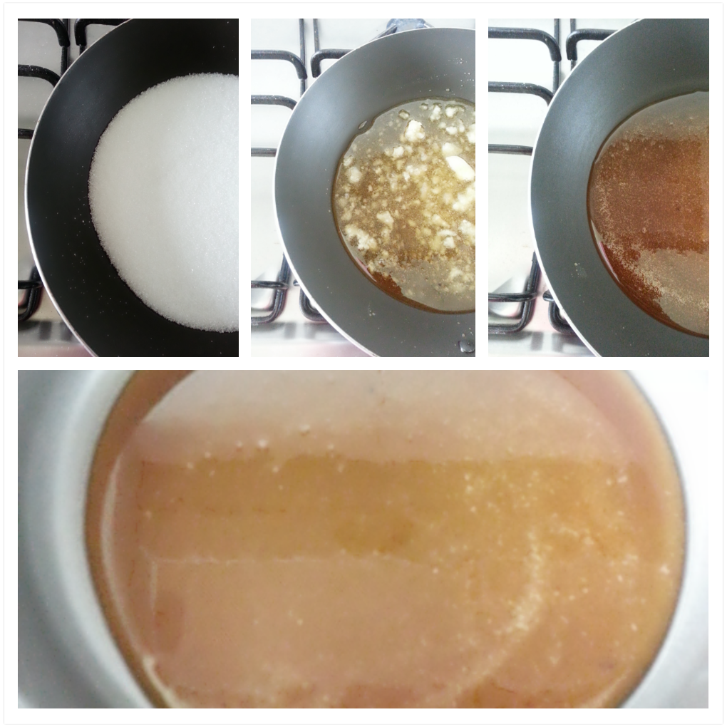 To caramelize the sugar, heat a sauce pan, add the sugar. Stir frequently till the sugar turns to a syrup. Once the syrup starts to turn dark brown turn off the heat (start to look like a maple syrup). Please make sure not to burn. Transfer the caramelized sugar to a oven proof dish. Swirl the dish so the sugar is spread evenly to all sides and well coated. You will need to do this quickly as the caramelized sugar will tend to set very fast. Once done set aside.