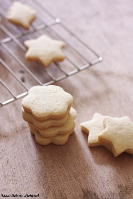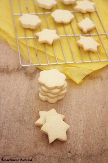 Add the flours and mix to a firm dough. Move the dough to a floured surface and roll out until 1/4 inch thick. Using a cookie cutter (s), cut into shapes. (I used different shapes).