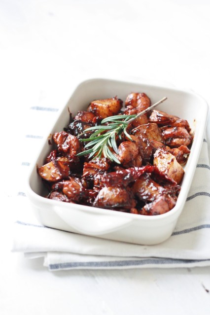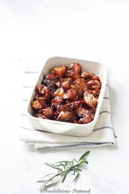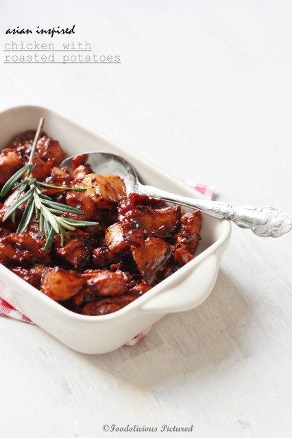 Add the roasted potatoes along rosemary and mix well. Now add the soy sauce, chili sauce and honey. Stir well and cook till the sauce is thick and chicken is done.