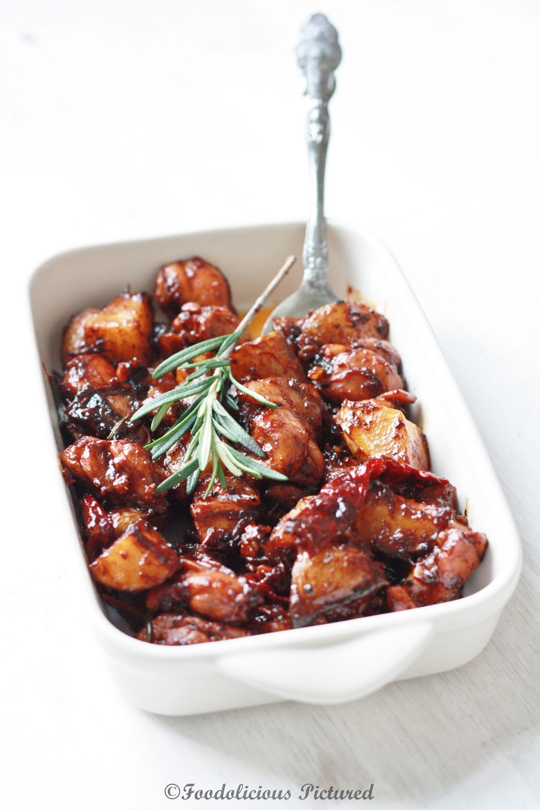 Add the roasted potatoes along rosemary and mix well. Now add the soy sauce, chili sauce and honey. Stir well and cook till the sauce is thick and chicken is done.