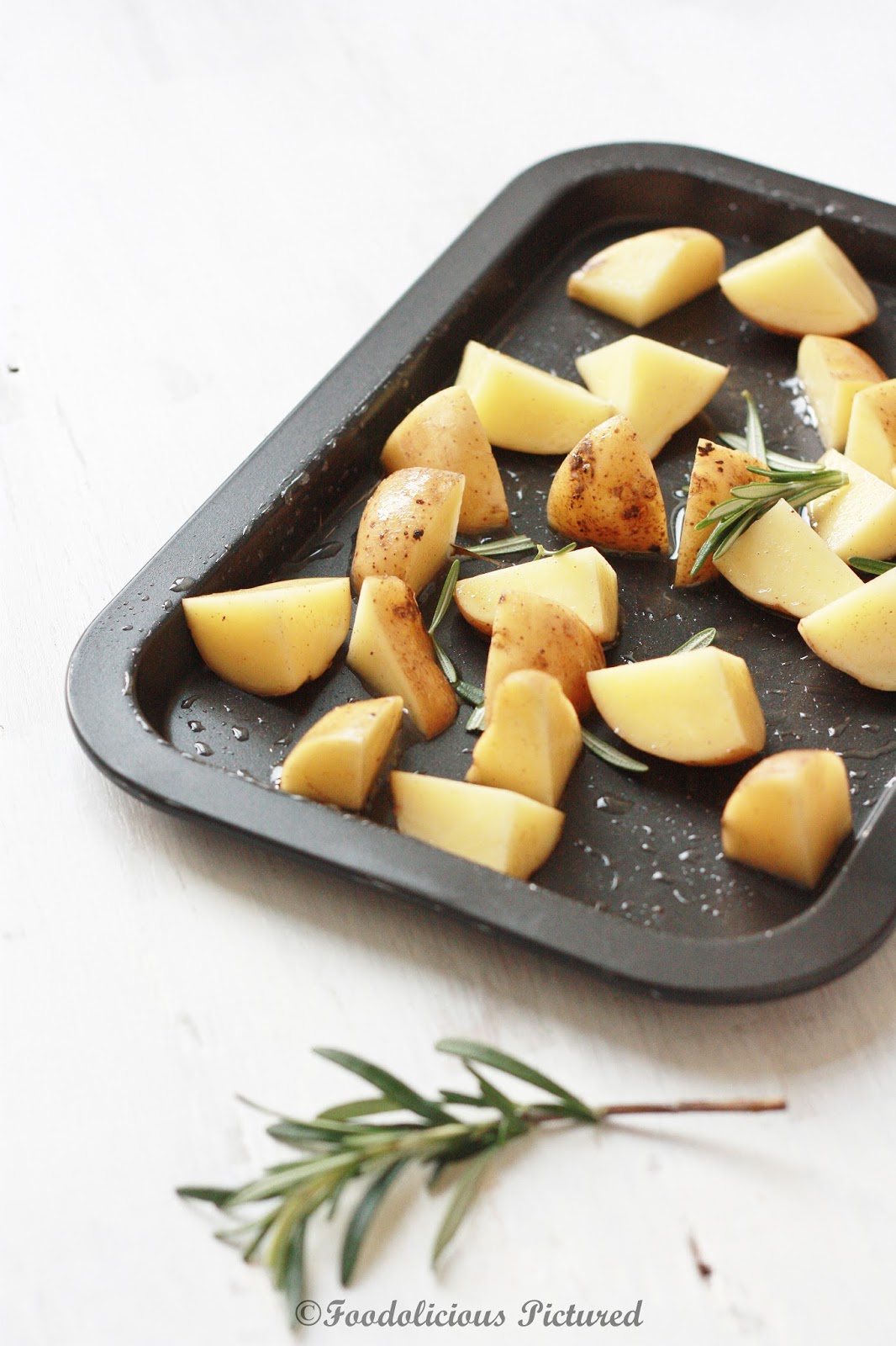 In a baking tray, put the potatoes, rosemary, garlic (with skin on); sprinkle the ground oregano and drizzle around 1 tablespoon of oil. Toss well and bake for 30 minutes or until they are tender and golden tossing them twice in between. Remove and set aside. Remove the garlic ; peal the skin and mash it.