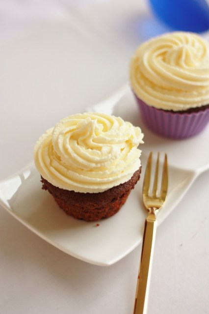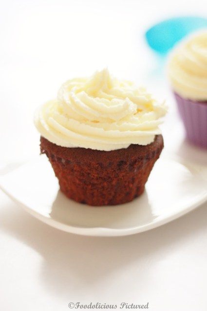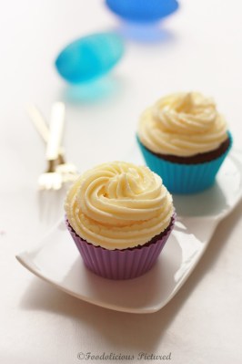 Spoon the batter into the prepared cupcake cases and bake for 25-30 minutes or till the tooth pick comes out clean when inserted in the middle of the cake. Cool them for 10 minutes and then place on a cooling rack to cool completely.