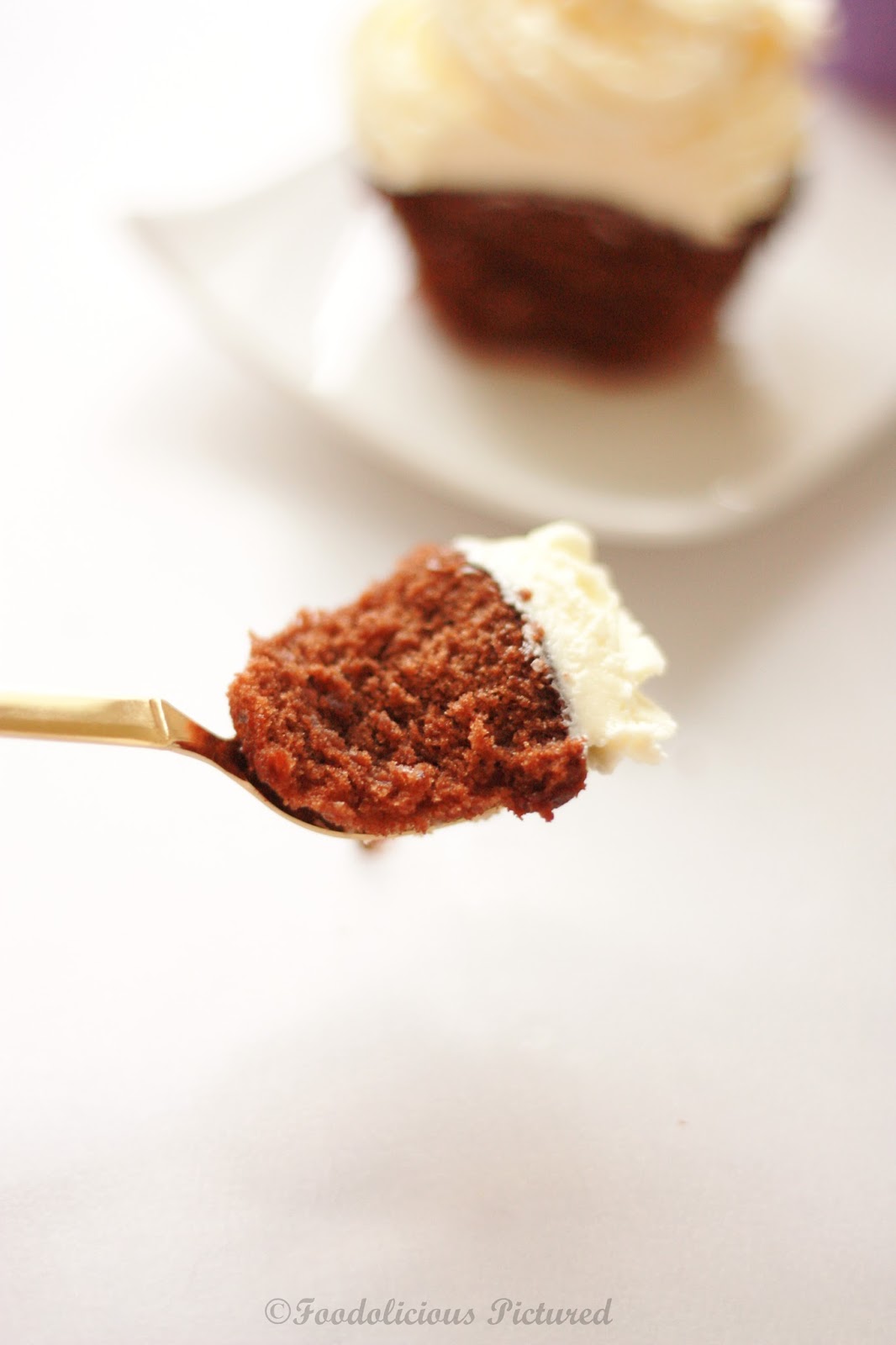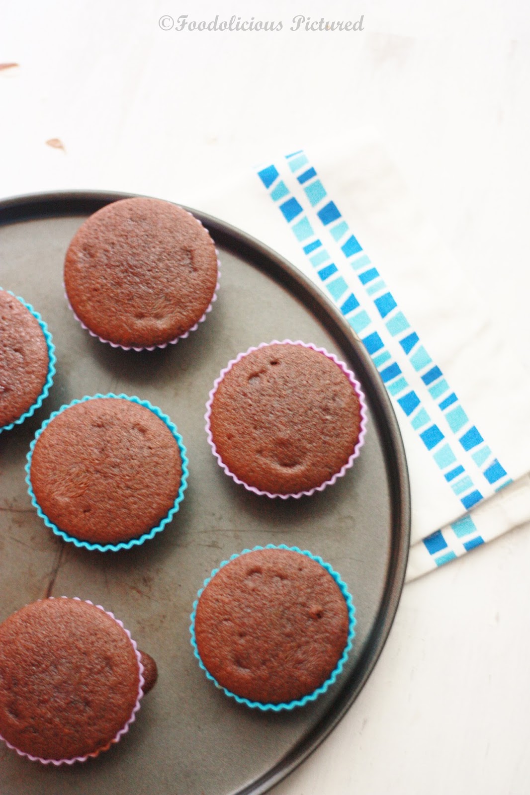 Spoon the batter into the prepared cupcake cases and bake for 25-30 minutes or till the tooth pick comes out clean when inserted in the middle of the cake. Cool them for 10 minutes and then place on a cooling rack to cool completely.