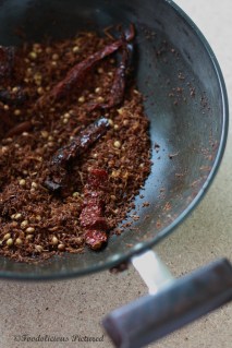 In skillet/kadai , dry roast all ingredients under “For dry roast” till dark brown but do not burn. Allow to cool and in a blender, make a fine paste with just adding very little water. Set aside.