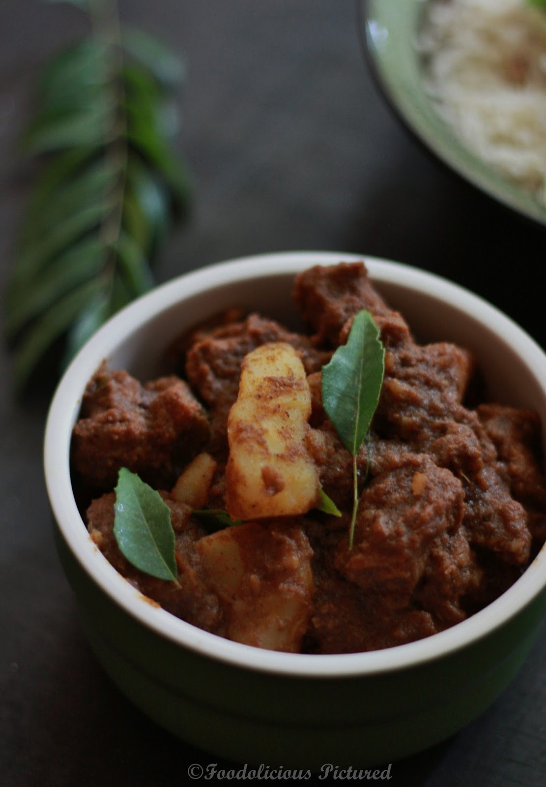 Add 1/4-1/2 cup water and pressure cook till the beef is done. Turn off the heat and allow the steam to release on its own. Uncover and turn on the heat and continue to cook till the gravy is thick or add water to adjust the consistency of your choice. Add the potatoes and the remaining curry leaves, mix well and cook briefly for a few seconds.