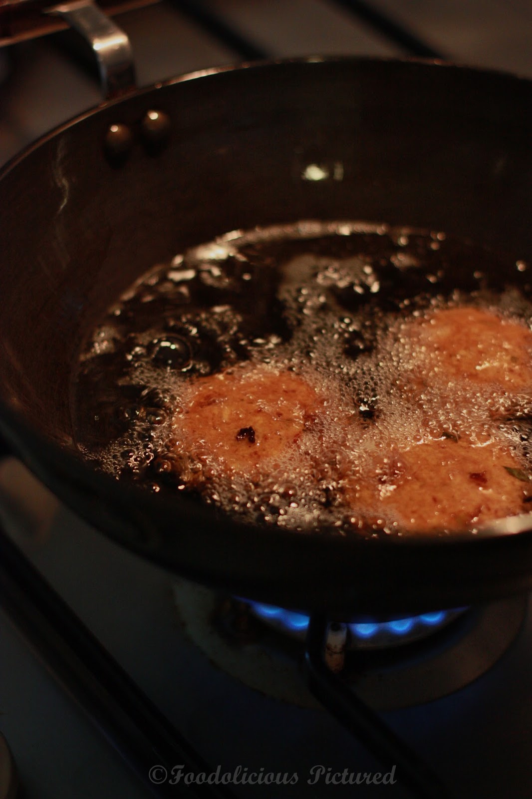 Heat oil in deep frying pan over medium heat. Once heated take the ball and flatten using your palm and carefully drop it into the hot oil. Fry till they brown evenly.
