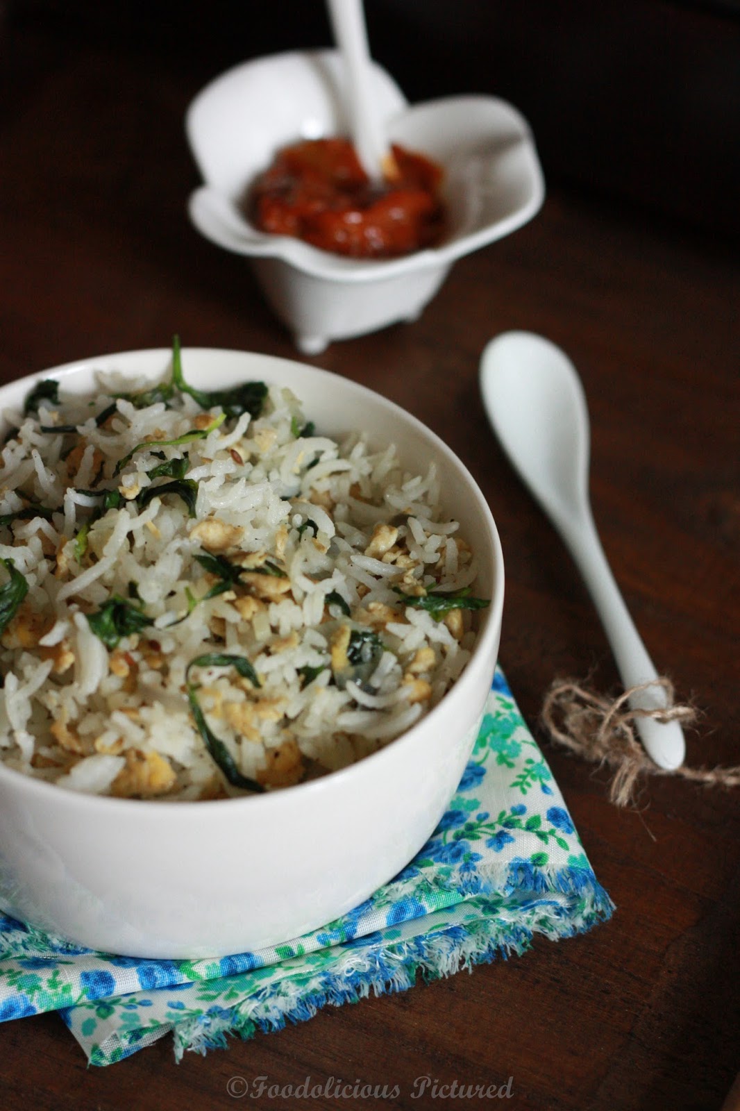 Add the fenugreek leaves and cook for a minute or two. Stir in scrambled eggs, .Add the rice, Salt and pepper and cook stirring frequently for about 3-4 minutes.