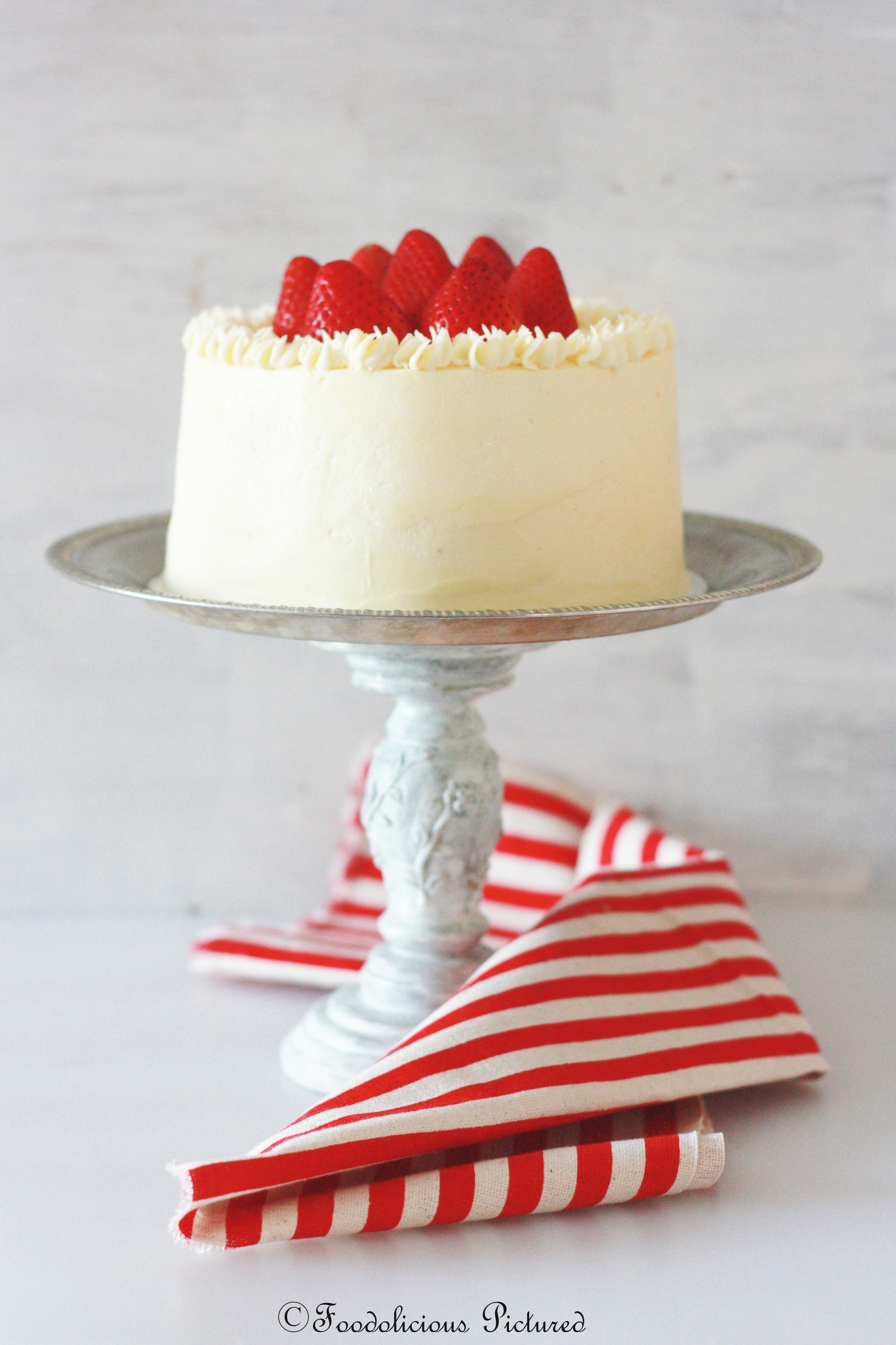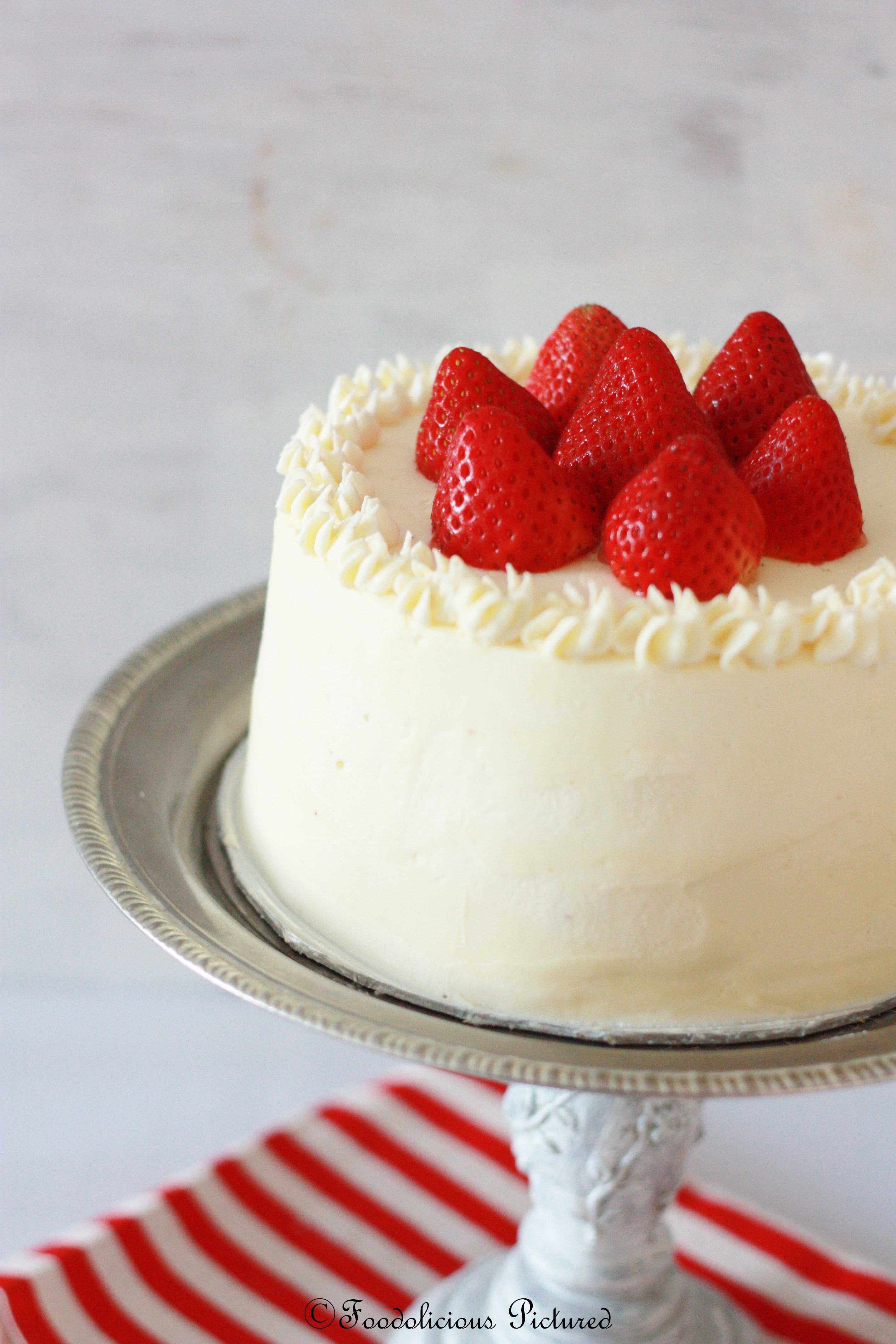 Assembling the cake, using a serrated knife level the top surface of each cake. Place the first cake on a cake plate. With an offset spatula spread 1/2 cup of buttercream evenly. Top with the second cake, bottom-side up. Crumb coat the cakes by spreading a thin layer of the buttercream. Refrigerate the for about 30-40 minutes. Apply the final coat by spreading the frosting evenly over top and sides of cake. Smooth the cake with the spatula. Decorate with fresh strawberries on top.