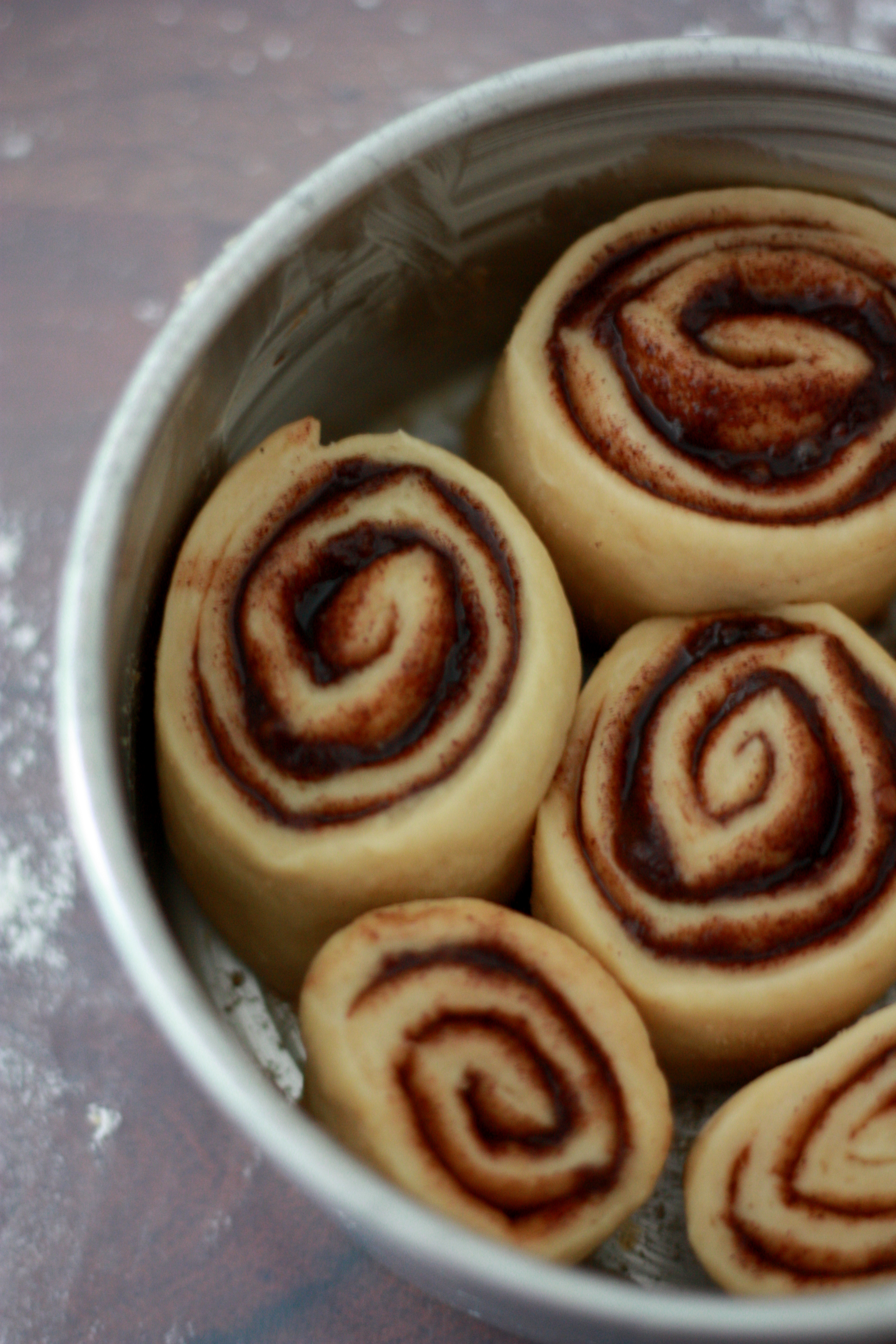 Slice the log into equal sections (around 7-8). Slightly grease a baking pan and sprinkle with sugar. Place the sliced rolls close together in the pan and let rise until it is doubled, about 30-45 minutes.