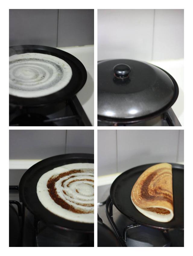 Drizzle about ½ teaspoon of oil and cover with a lid and cook for about 2 minutes or till the dosa has well browned and crisp. Uncover and flip over and cook for a few seconds.