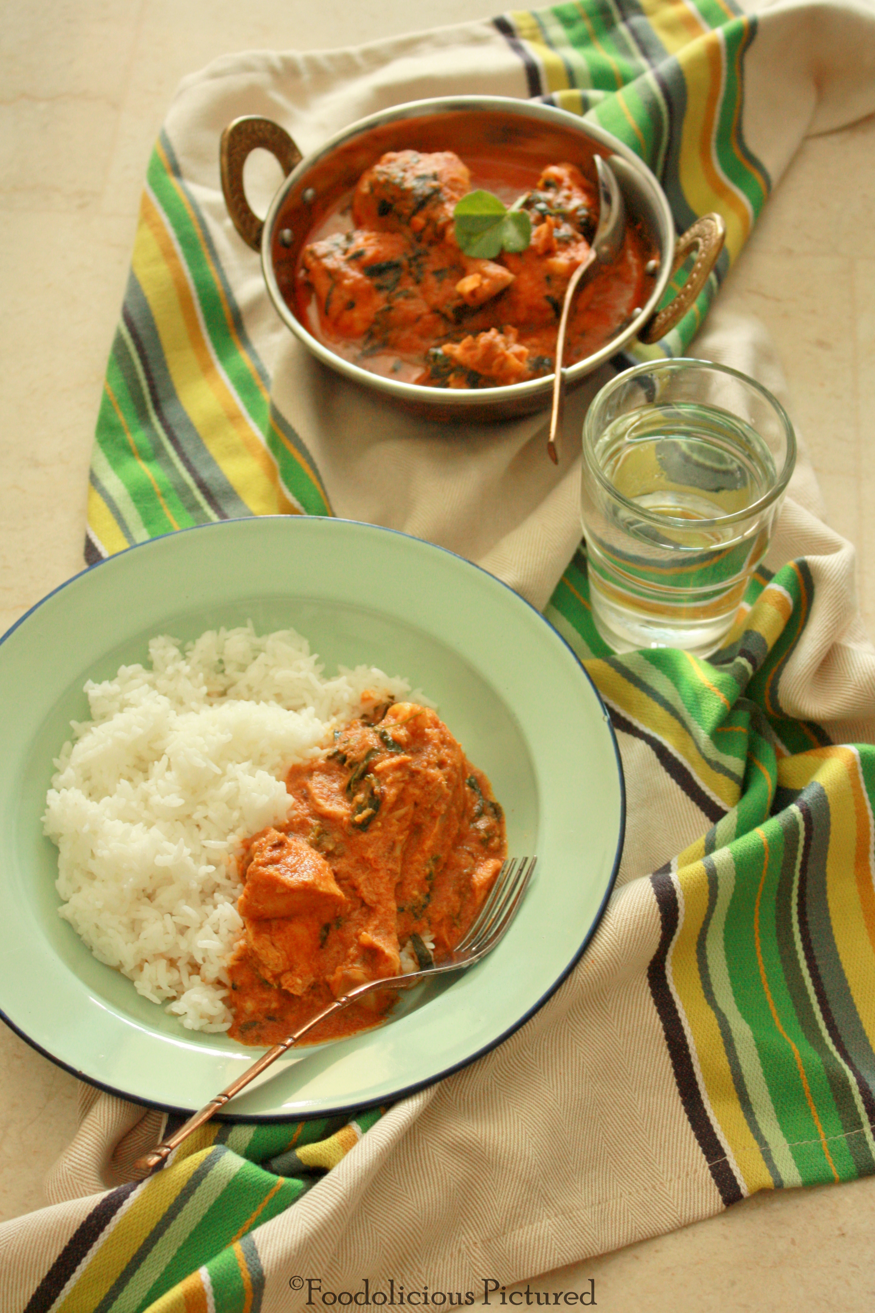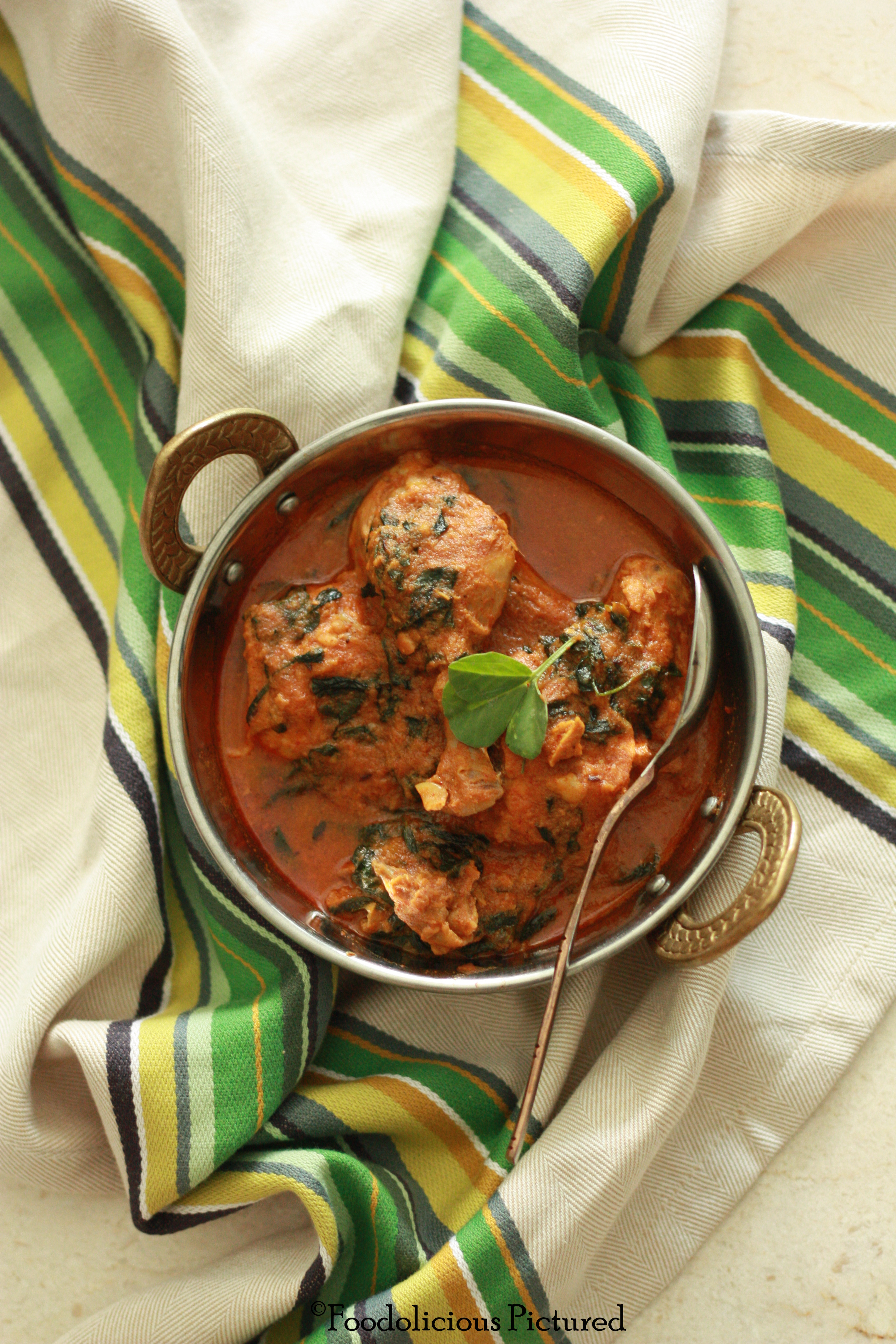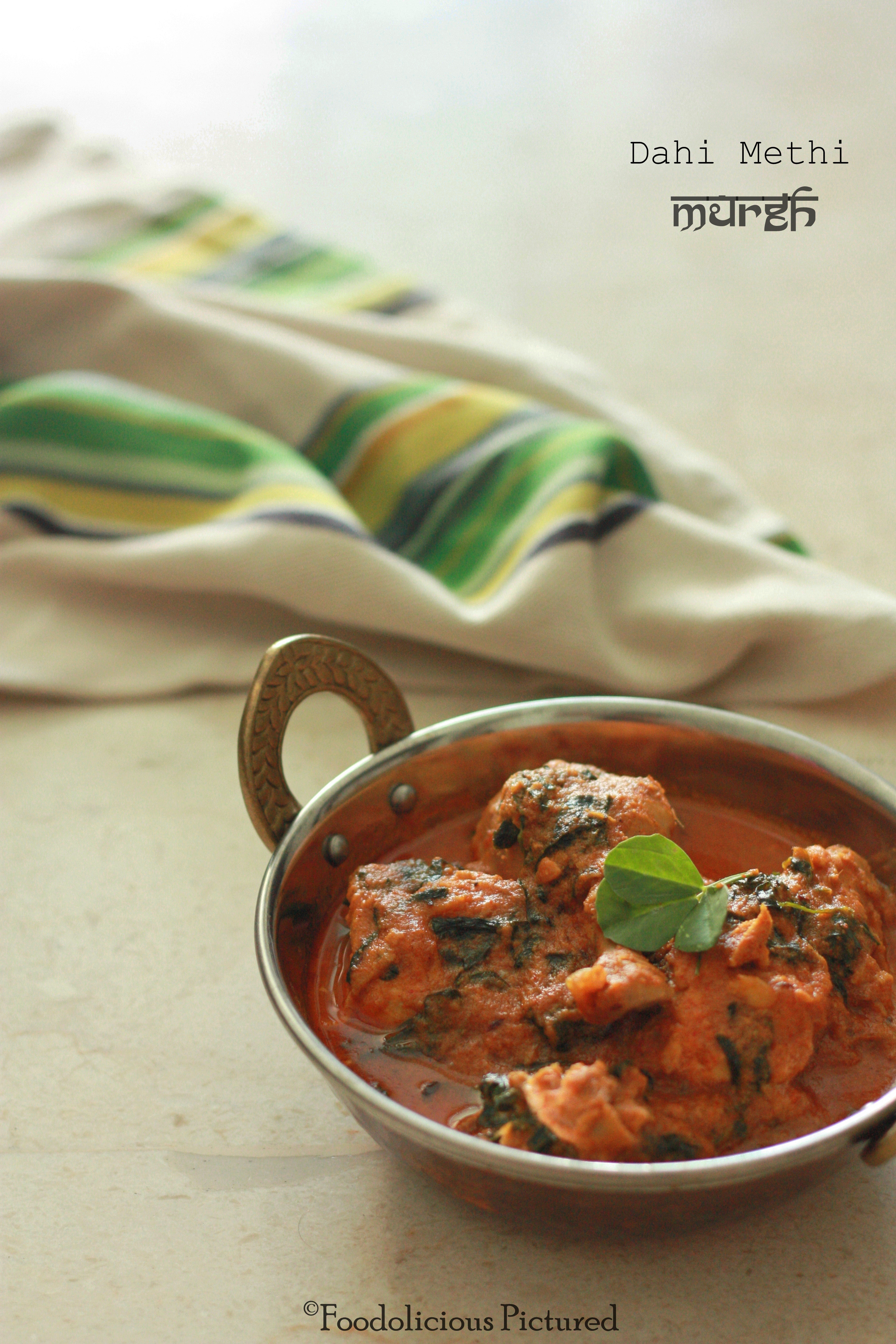 A delicately spiced delicious curry! The chicken here is cooked in a yogurt based sauce till succulent, with fresh fenugreek leaves.  The curry has a thick gravy and goes perfectly with any Indian flat  bread or rice.