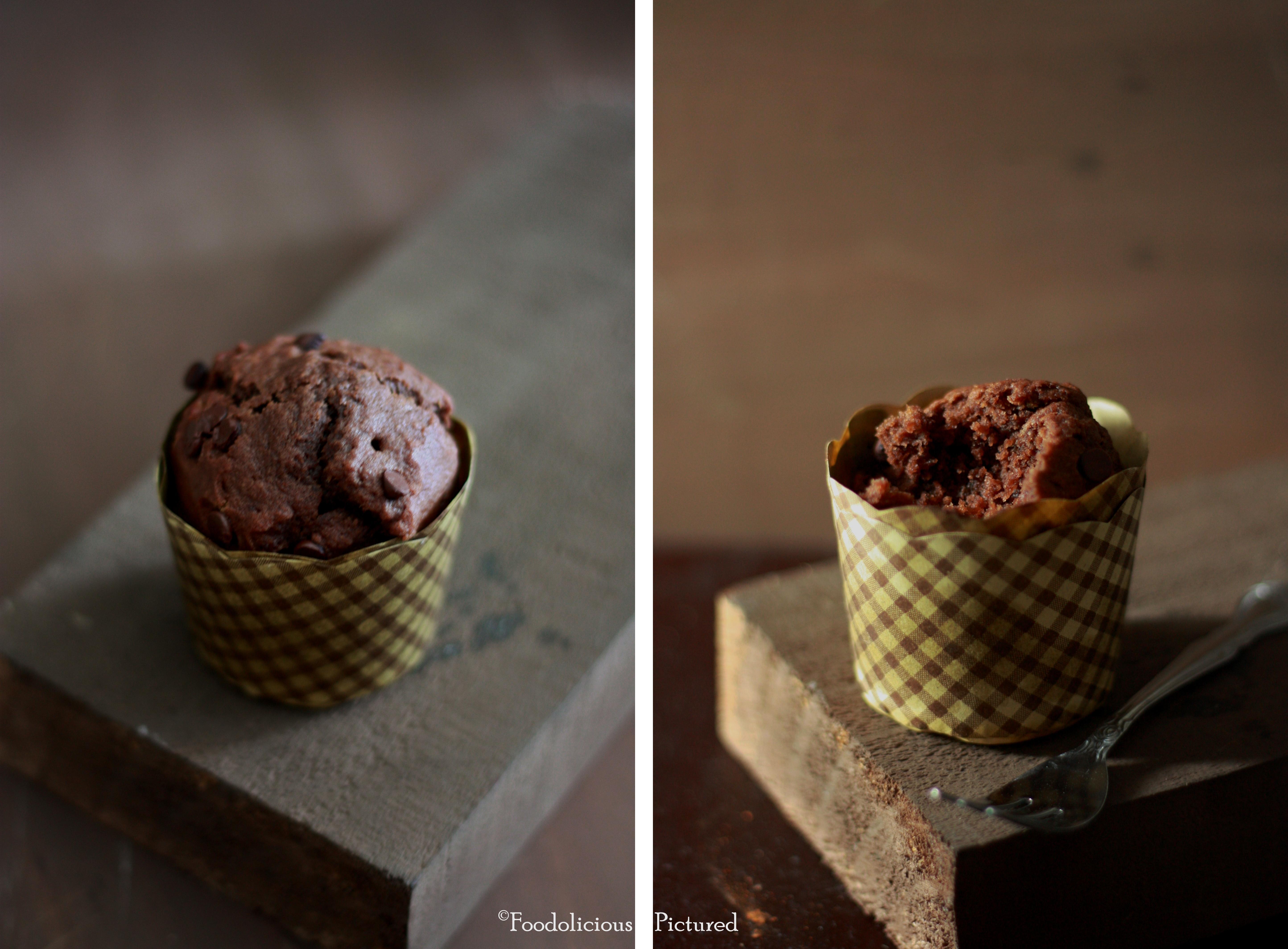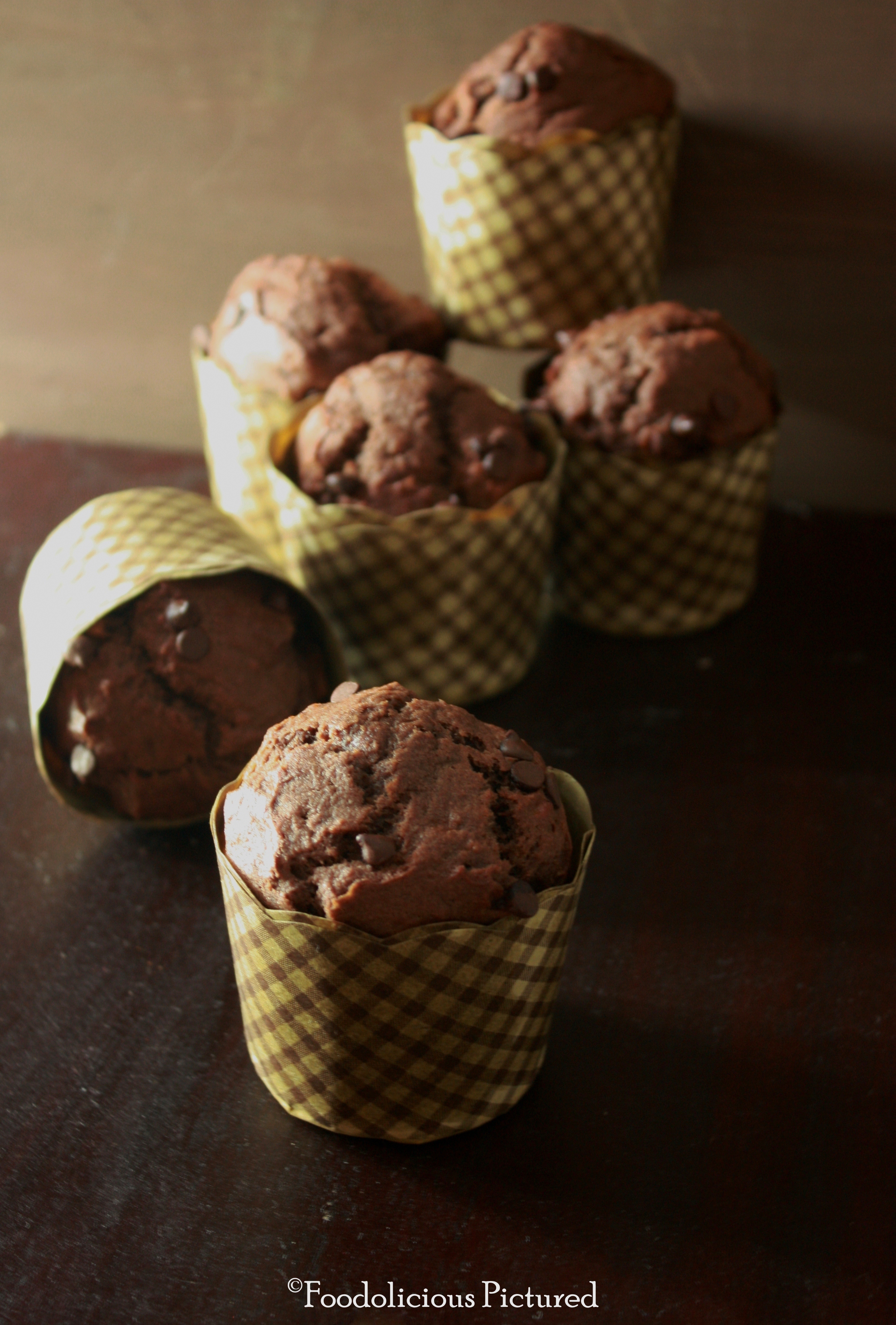 Pre-heat the oven to 200 C. Line the muffin tin with 8-10 paper liners.  In a bowl sift together the flour, baking powder, soda, coco powder and salt. Set aside.