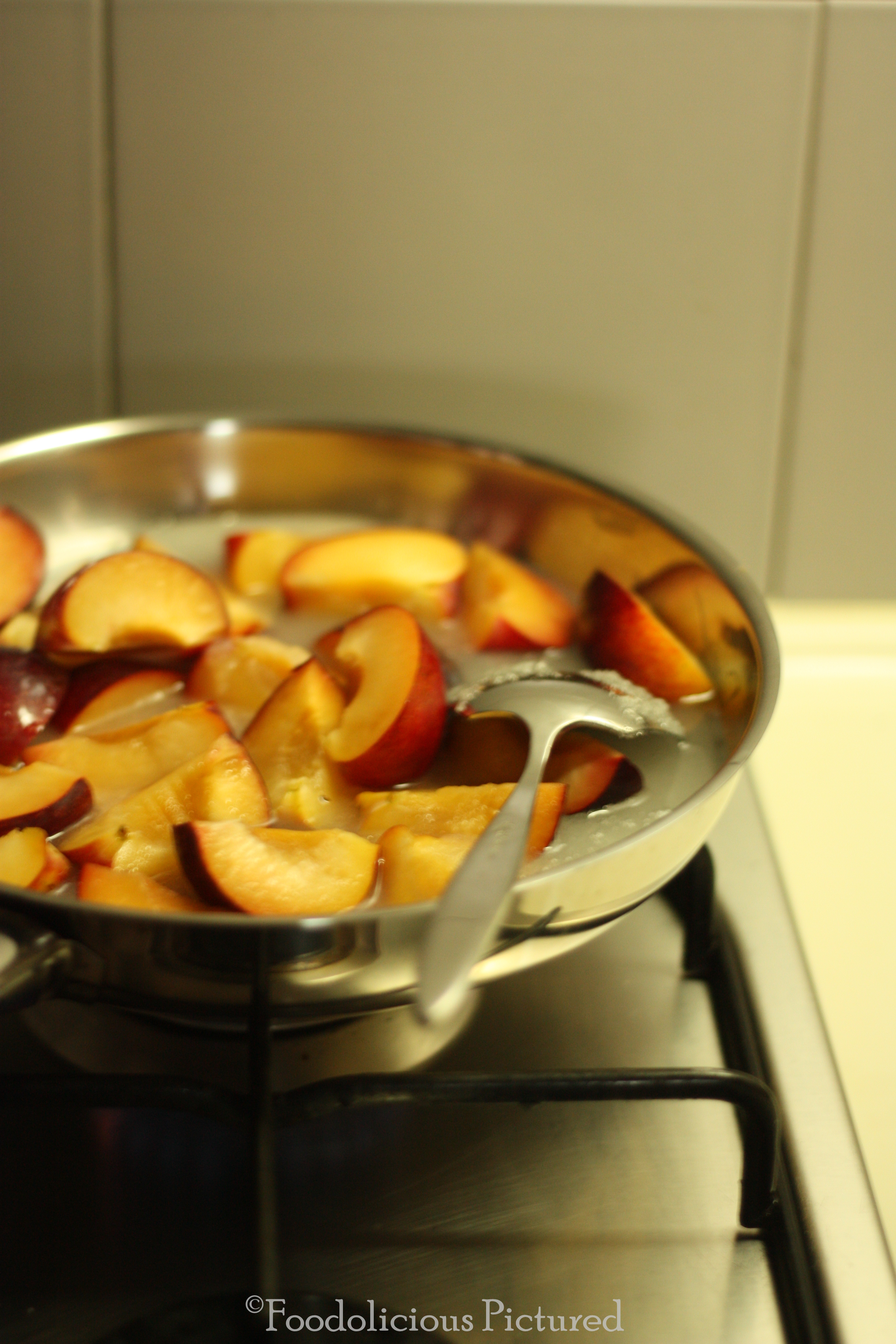 Halve the plums and remove the stones. In a heavy bottom sauce pan place the plums, sugar, lemon juice and water.