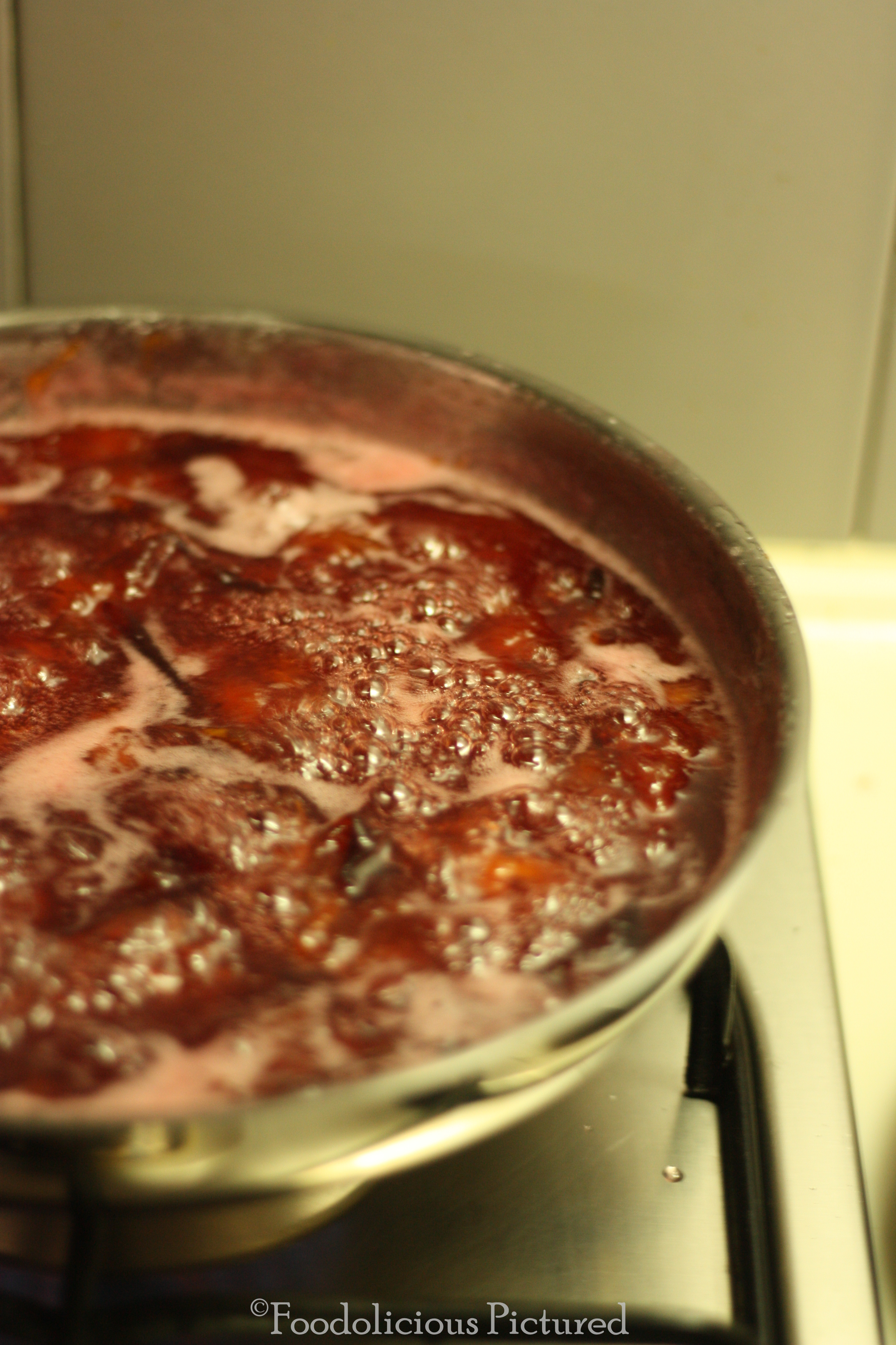 Cook over medium heat; stirring until the sugar has completely dissolved. Cook until jam is the jam reaches a setting point. To test, take a teaspoon of jam and place it on a saucer and let it cool. Now push your finger into the jam. It should start to wrinkle but if it’s still runny then you will have to continue to cook for couple of minutes more.  Please note the Jam will continue to thicken as it cools.