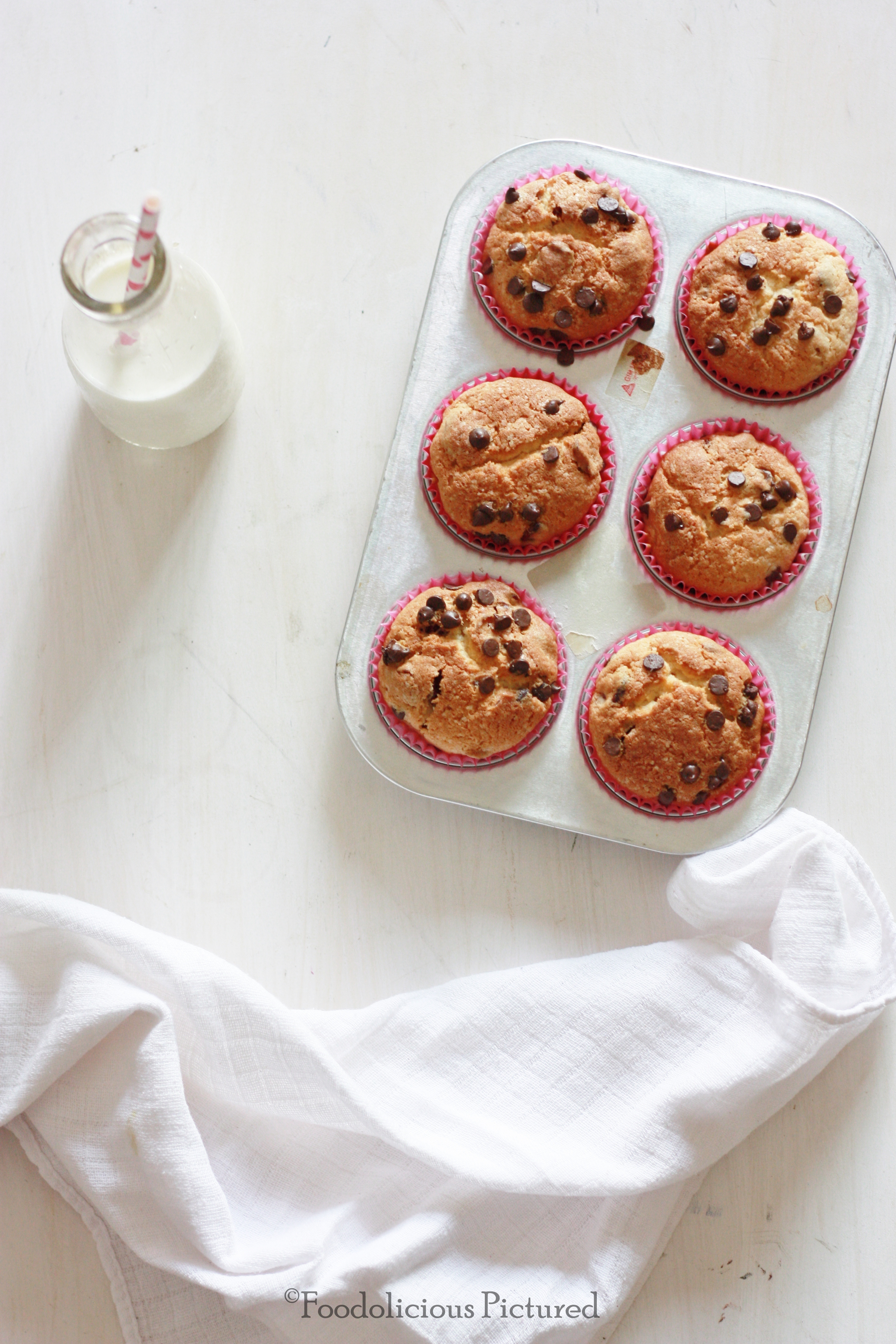 Spoon the mixture into the prepared muffin tin or cupcake/muffin cases. Sprinkle the choco-chips on top and bake for 40-45 mintues or when toothpick inserted in the center of the muffins comes out clean. Cool them for 10 minutes and then place on a cooling rack to cool completely.