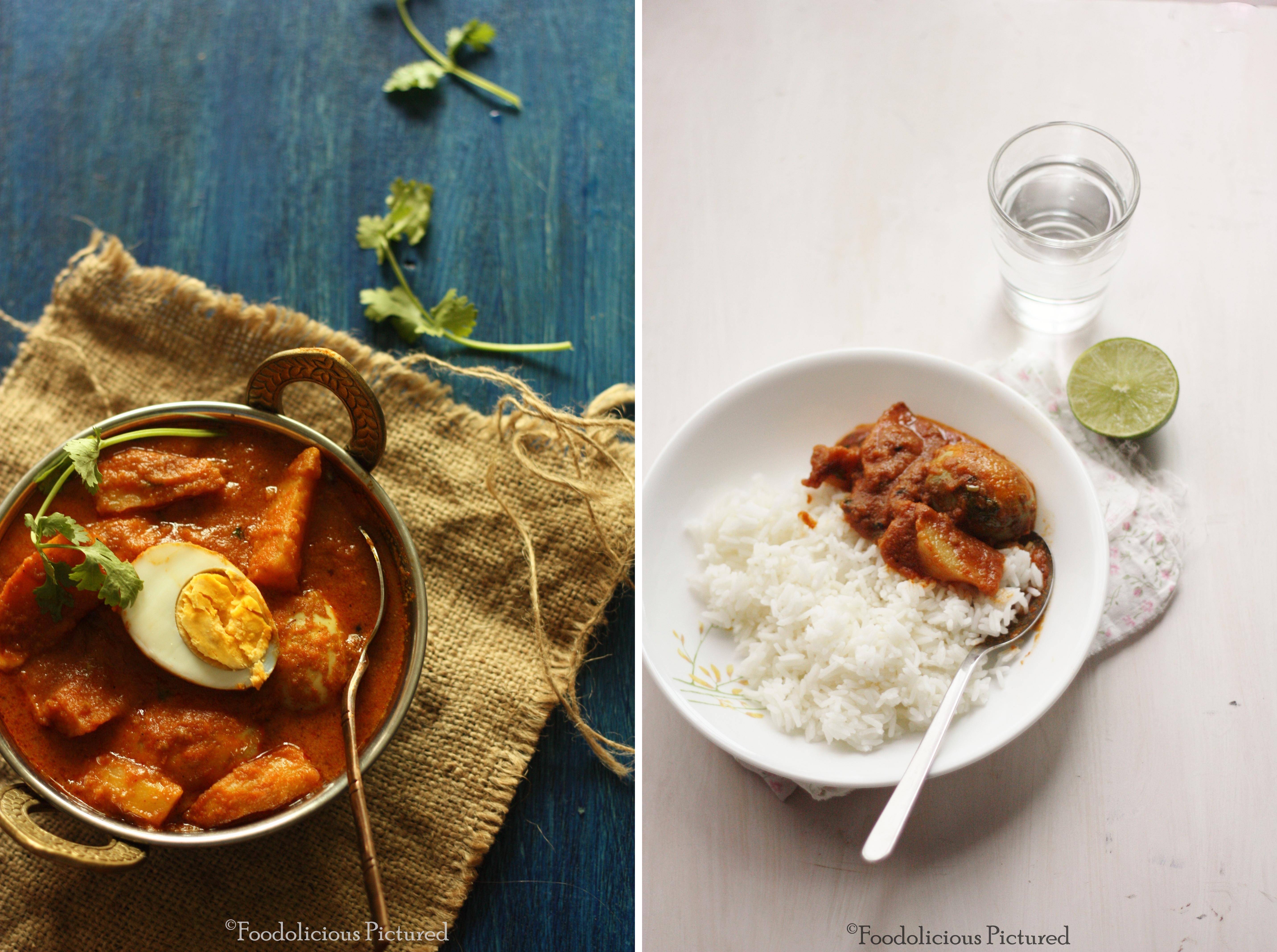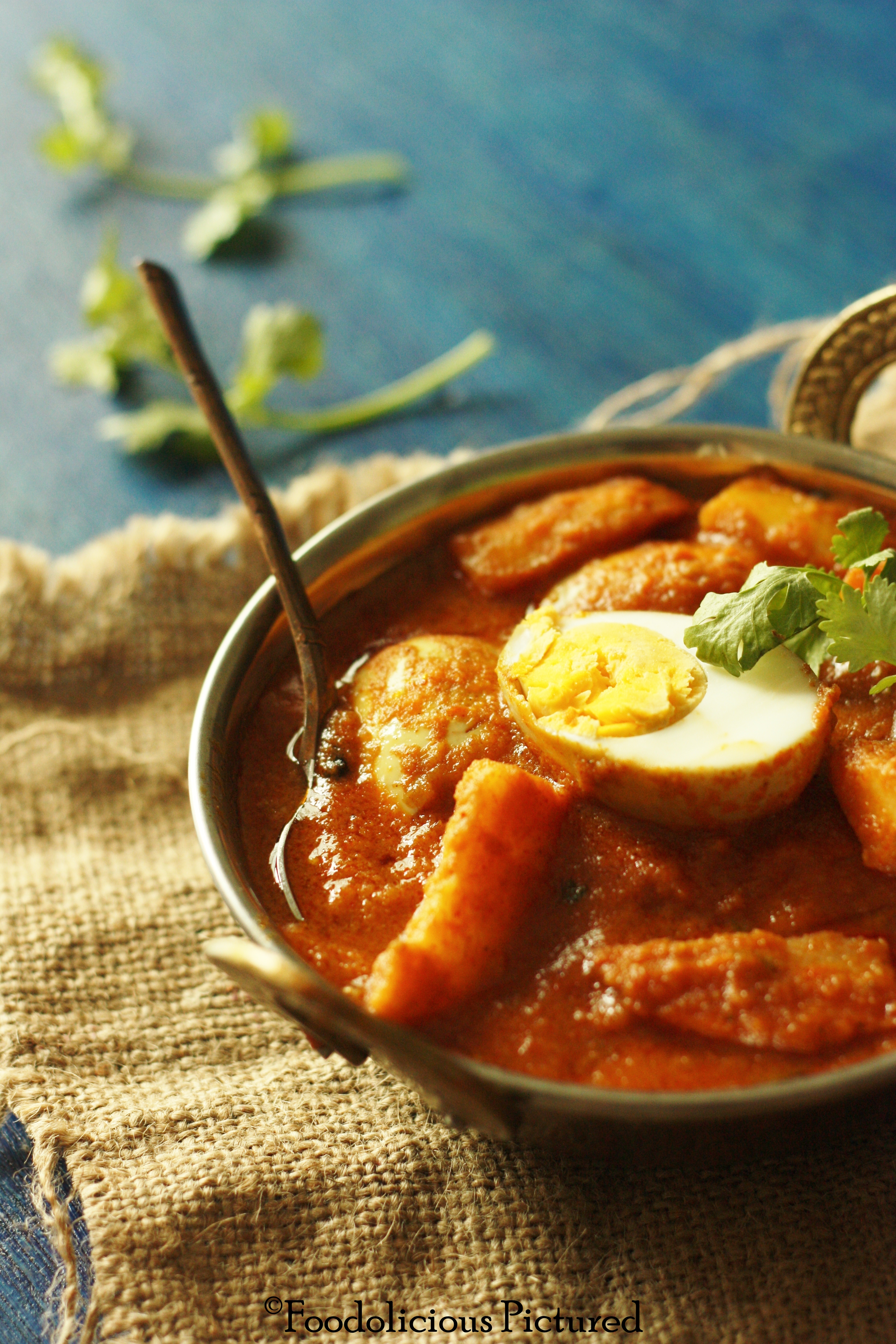 Add a cup of water, Salt to taste and bring to boil. Add the potatoes, egg and garam masala; reduce the heat and let it simmer for about 10 – 12 minutes. Turn the heat off and sprinkle the chopped corriander leaves. Serve with rice or any Indian flat bread.