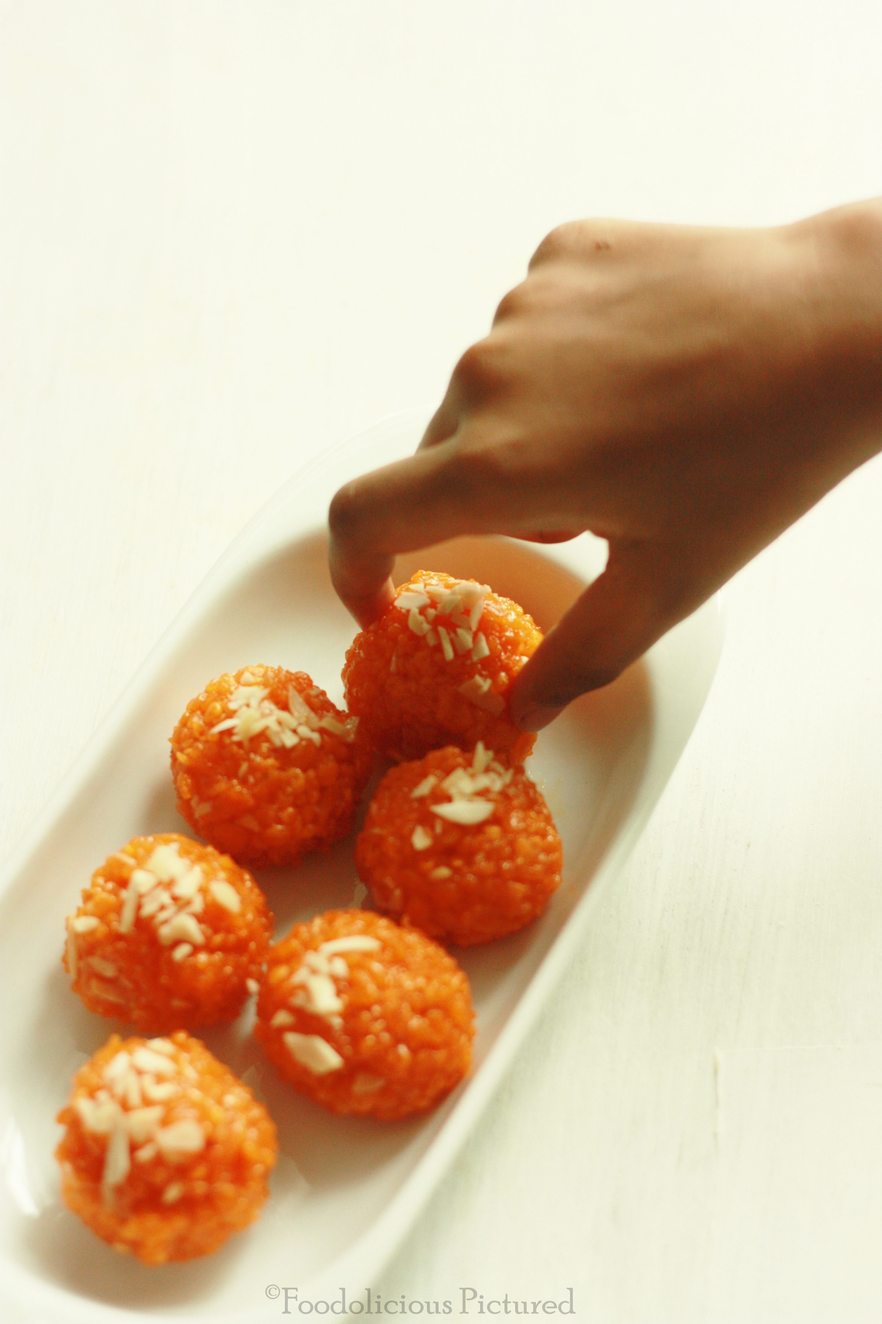 Chickpeas/besan flour along with clarified butter and a pinch of orange food color is mixed and made to a thin batter which is then poured through a perforated spoon/ladle into hot oil. Soon the batter hits the oil it forms into  tiny balls called boondis. Later soaked in sugar syrup and rolled into equal sized balls once the boondis absorbs all the syrup. You can garnish them with pistachios, almonds, cashews or raisins. Make  sure you let them sit for a couple of hours after you roll them into balls.