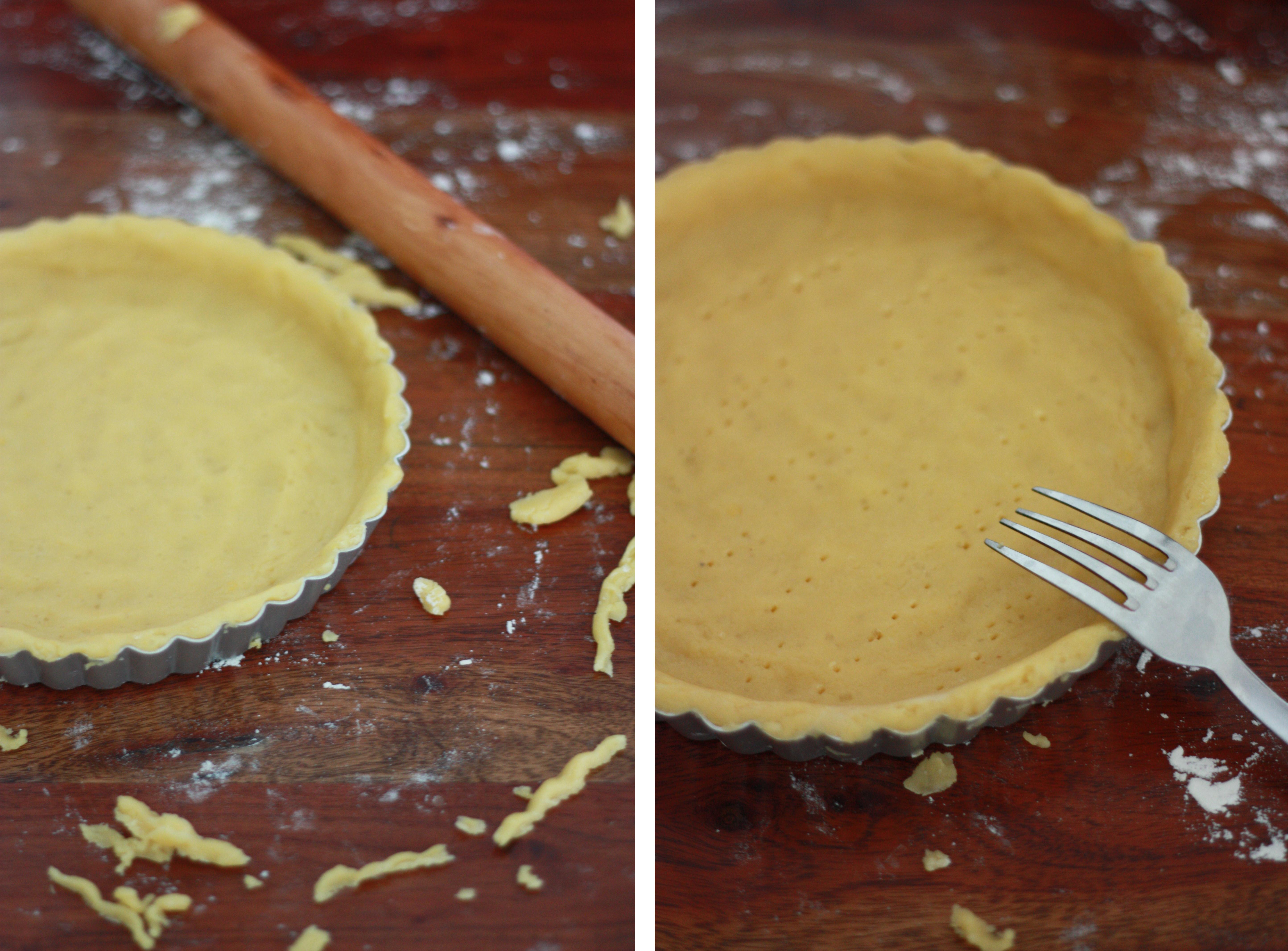 The last time I kind of struggled with rolling the dough, so this time around, I just pressed the dough into the tart pan with my fingers. This worked well (at least for me) as the dough hardly cracked and got perfectly pressed into the pan. But leave that to you; if want you use a rolling pin and roll into disc and then gently press it into the pan. And so is with the baking the crust. I poked the centre of crust with a fork to prevent the pastry from puffing up. Alternately you could place a baking sheet on top of the pastry and fill with dried beans and then bake; both ways work well.