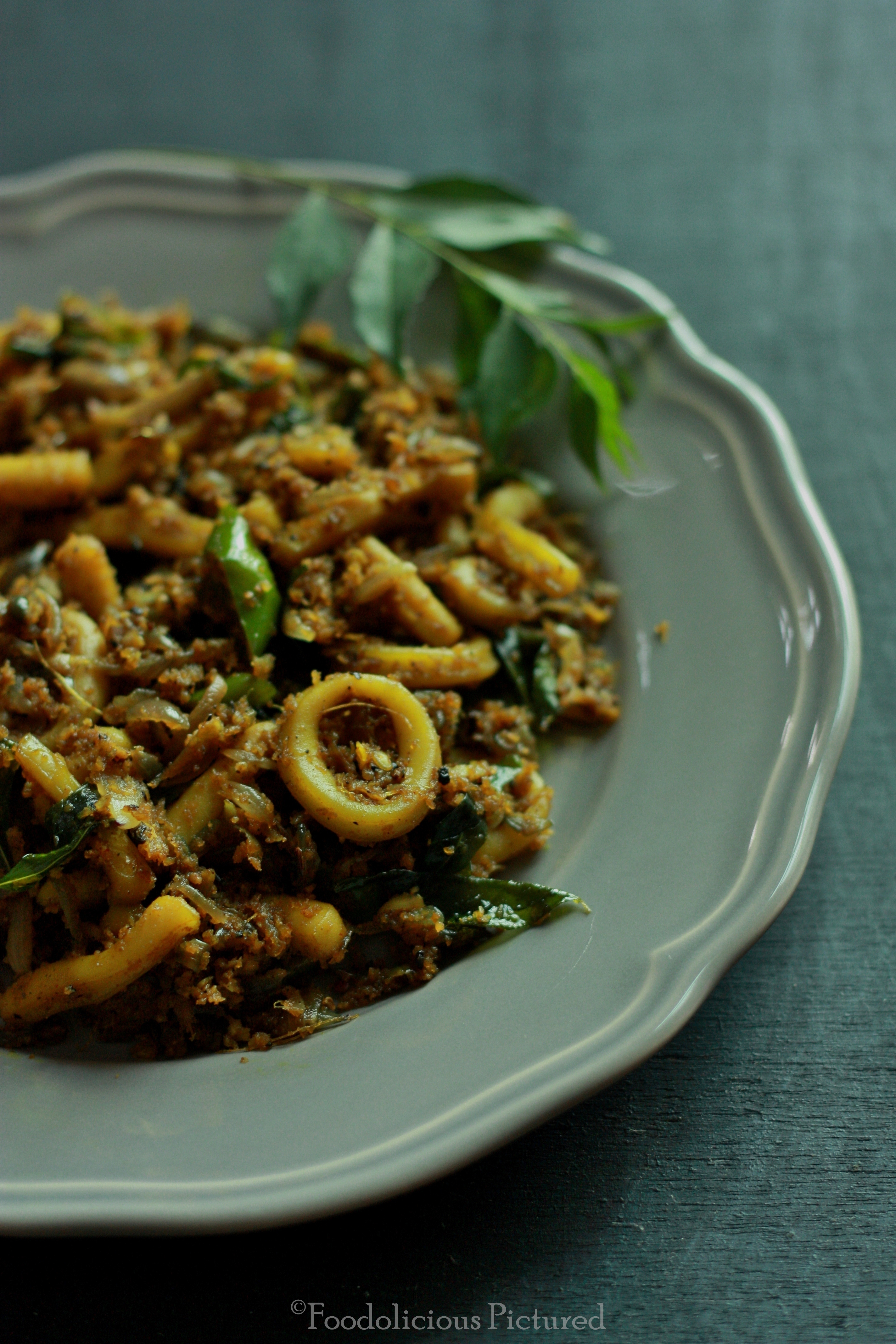 Kanava Thoran or Squid/Calamari stir fried with coconut – another walk down the memory lane with a childhood favourite! My mom never had a liking for squid, for the reason that she never liked to clean. So it was my aunt who always used to make this for me, and really happy to share a slice of happiness (her recipe) from my childhood.
