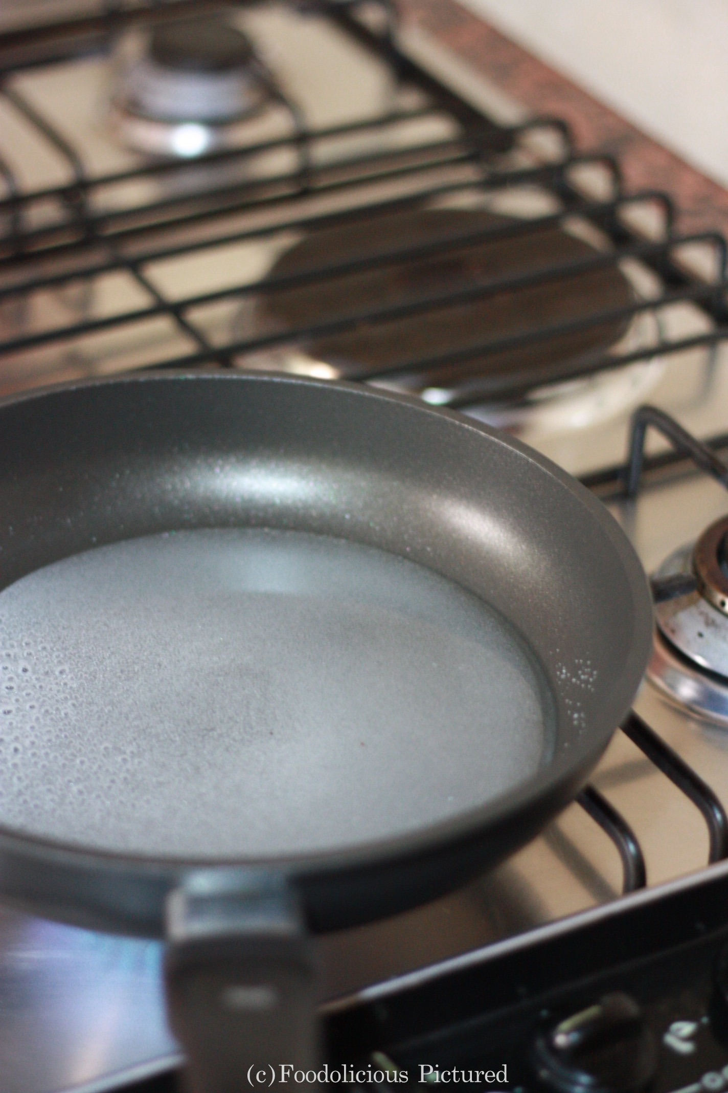 In a non stick pan add the sugar, rose essence and water. Simmer till the sugar dissolves completely and almost reaches a one string consistency or when you drop a few drops of the sugar syrup into a small bowl of water it should not dissolve immediately.