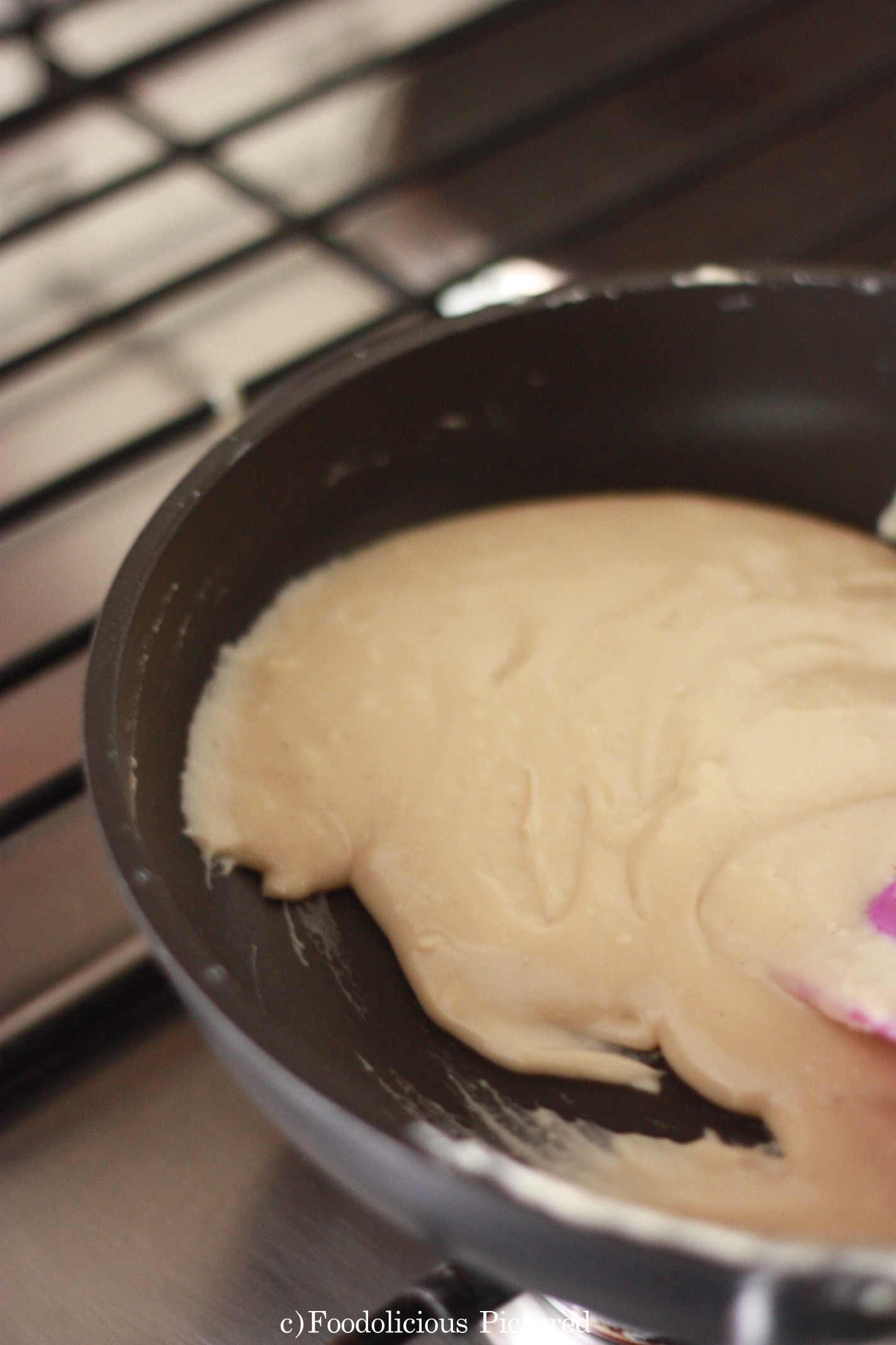 Turn the heat off and remove the mixture into the plate which you have greased with ghee. Once the mixture is hot enough to handle, apply some ghee to your palm and start to kneed the mixture into smooth and lump free dough.