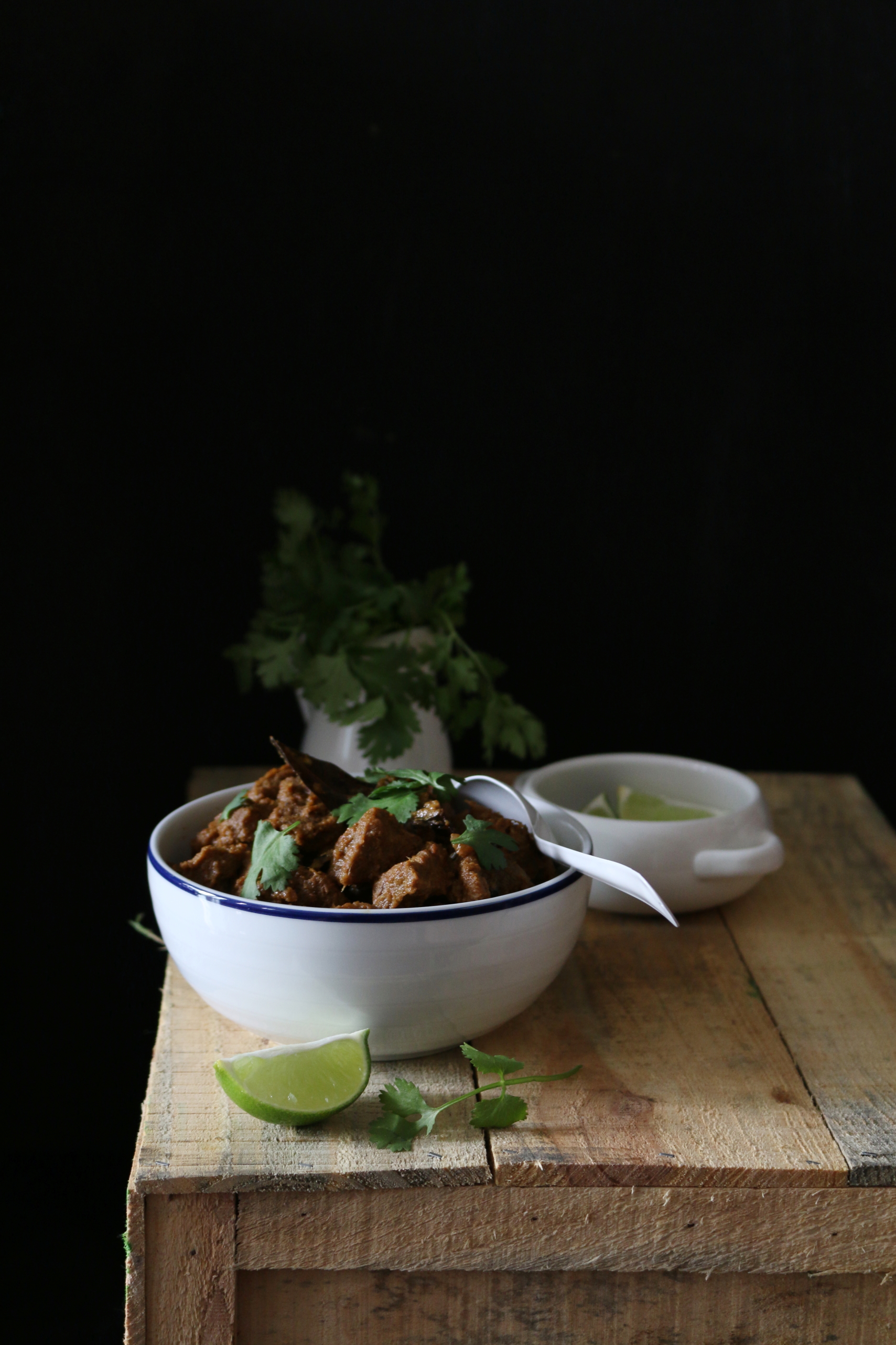 In the Bhuna style of cooking the meat is pan-fried/seared with a gravy/sauce made of dry-roasted whole spices along with flavorful spice-mix and yogurt. This process of cooking with the sauce in a medium-hot pan ensures that all the beautiful spice notes are well-instilled in the meat.