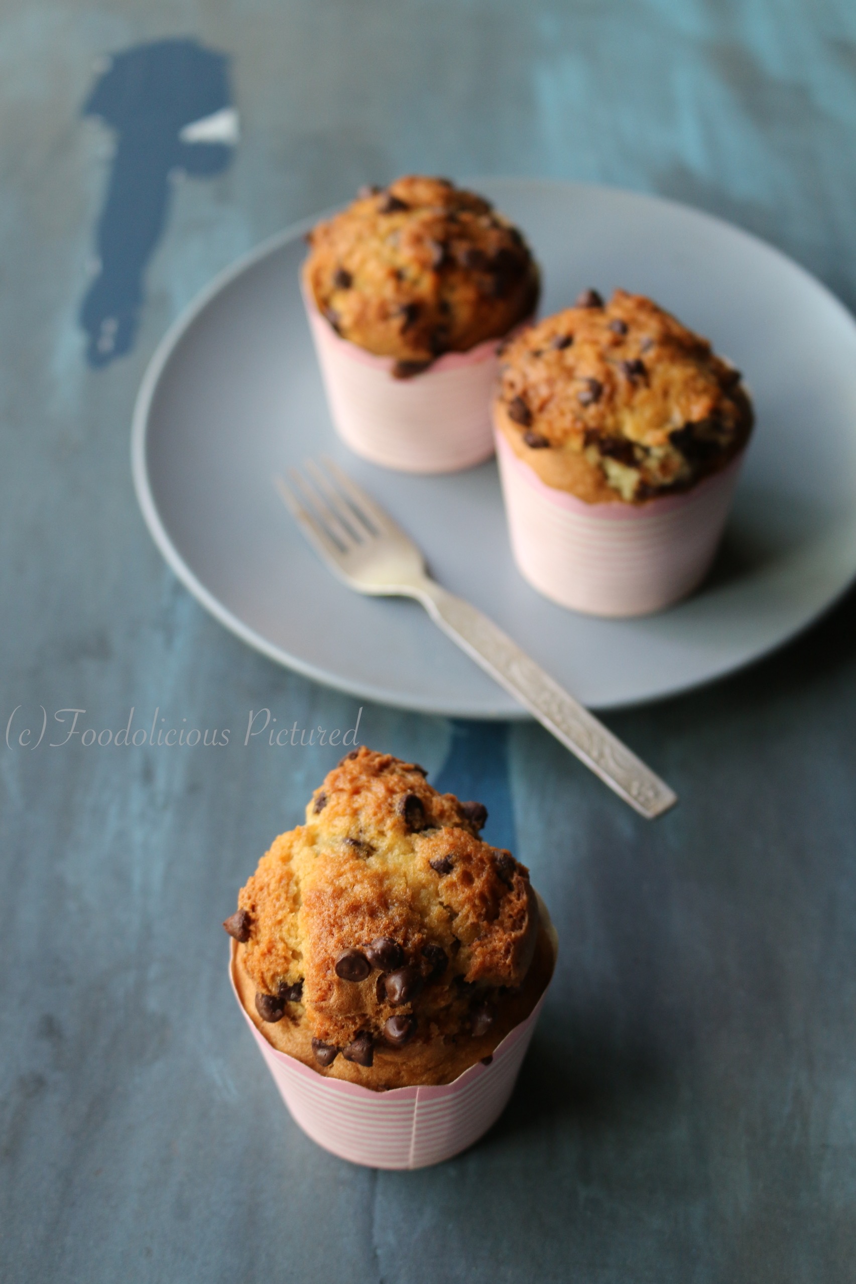 Fold in 2 cups choco-chips. Mix gently till everything is well combined. Make sure not to over mix the batter else the muffins will not be light and fluffy when you bake.