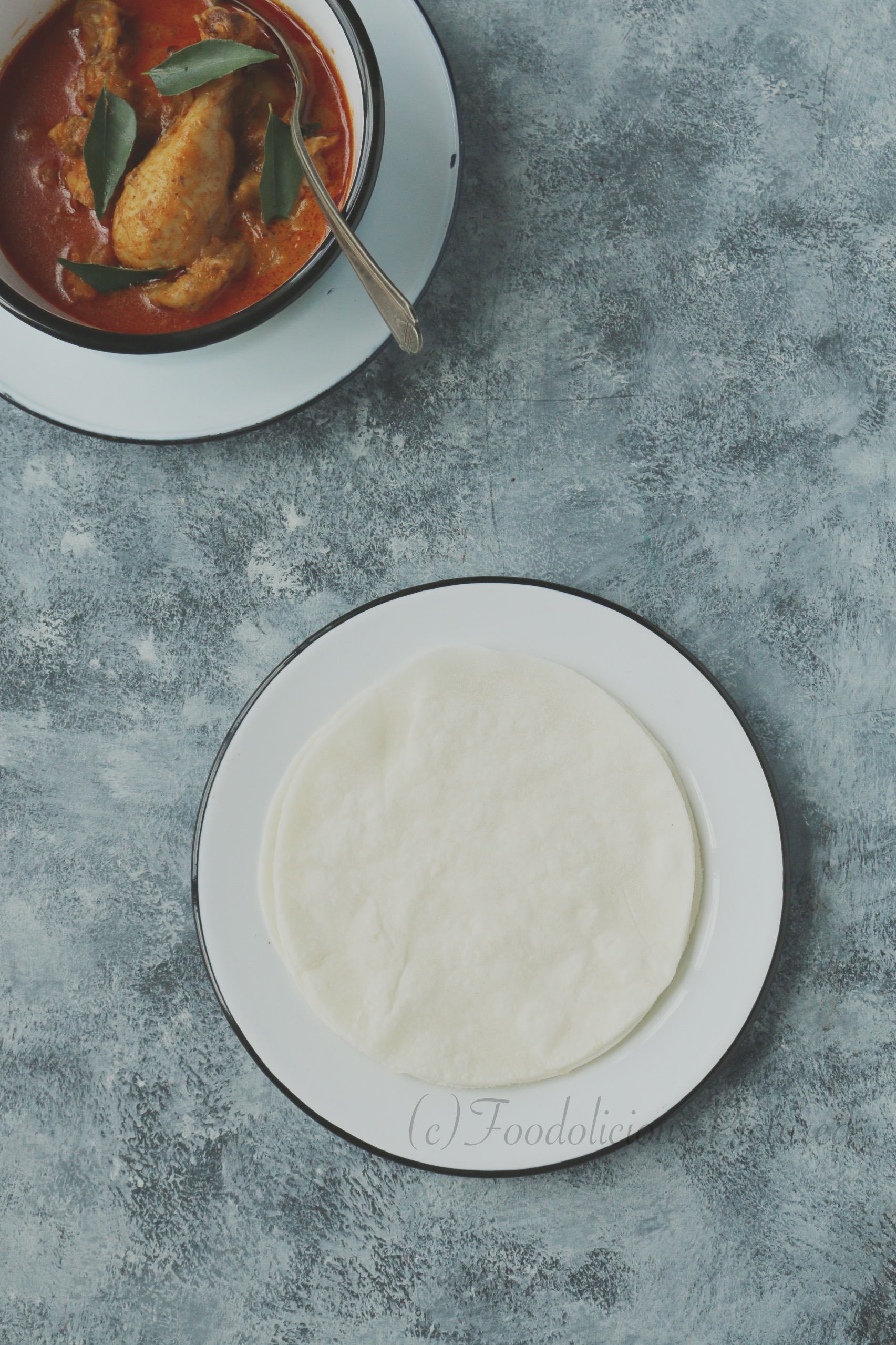 Talking of curries, (in my opinion) the best way to enjoy those lip-smacking curries is to have some beautiful rice pathiri by the side. Pathiris are thin flat breads made of rice flour, and I wouldn’t say it’s exactly a breeze to prepare as you need to work with hot dough; need to knead and shape the rice dough while it’s hot or it will crack, and is not easy to roll the dough into thin sheets. But I must say – it’s worth the effort! In this presentation, I have paired the pathiri with Kerala Chicken Curry.