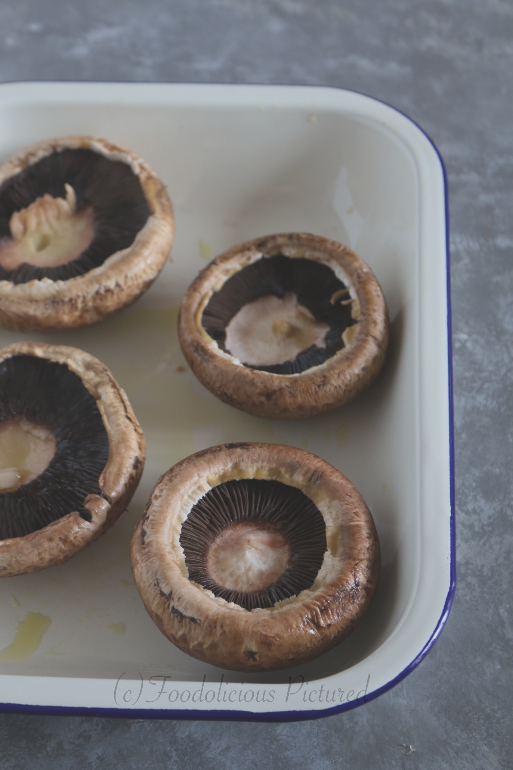 Pre-heat the oven to 190 C. Remove the stalks from the Portobello mushrooms. Clean the mushroom caps and pat dry.