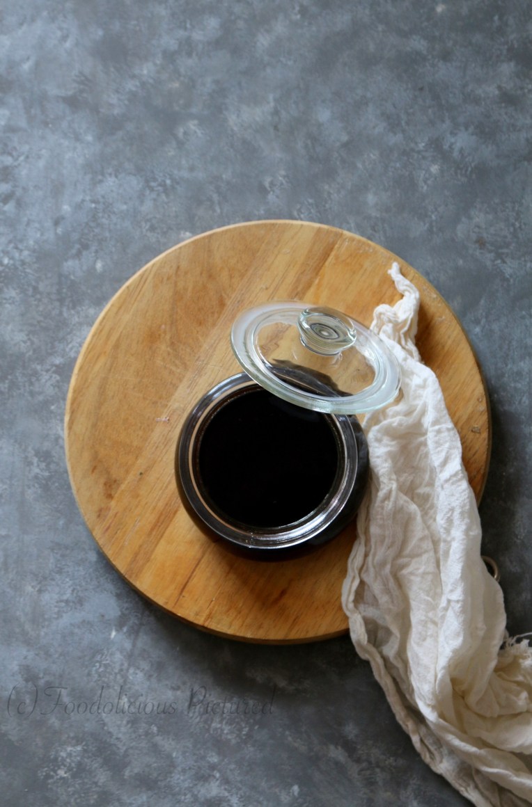 In a heavy bottom sauce pan, add the tamarind, jaggery and half cup water and boil till the Jaggery has melted.