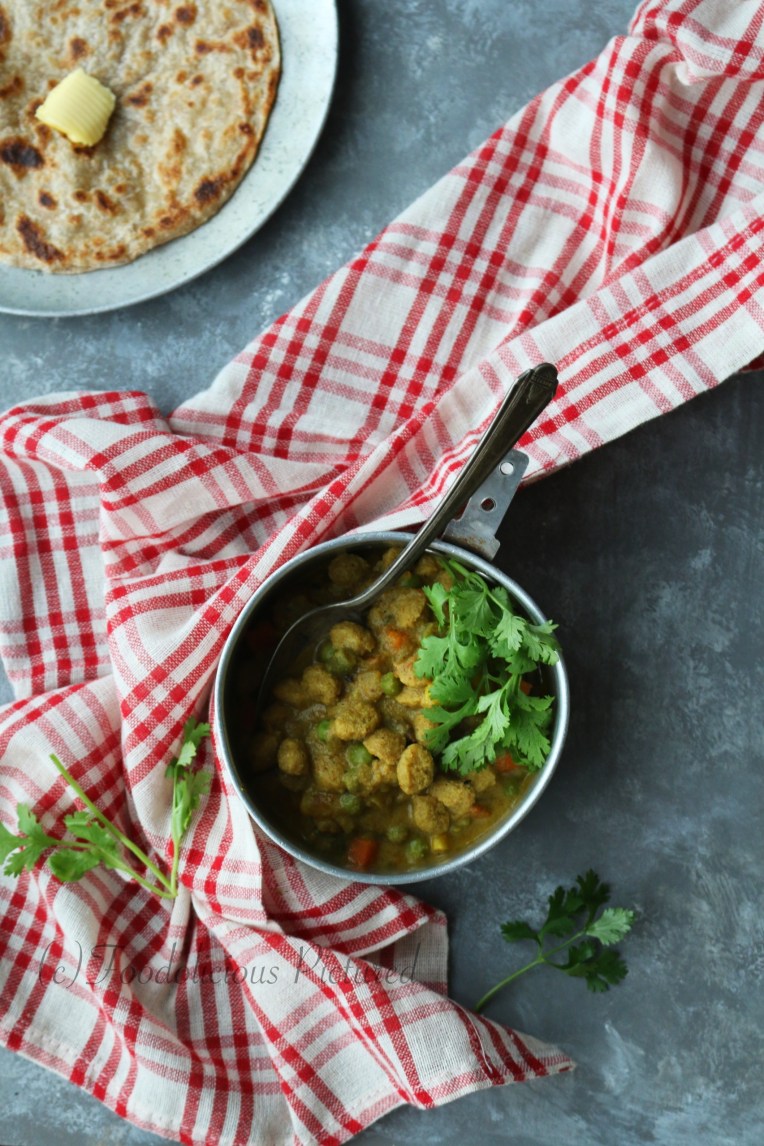 - Small soya chunks – 1 cup (soaked in hot water for an hour and drained)