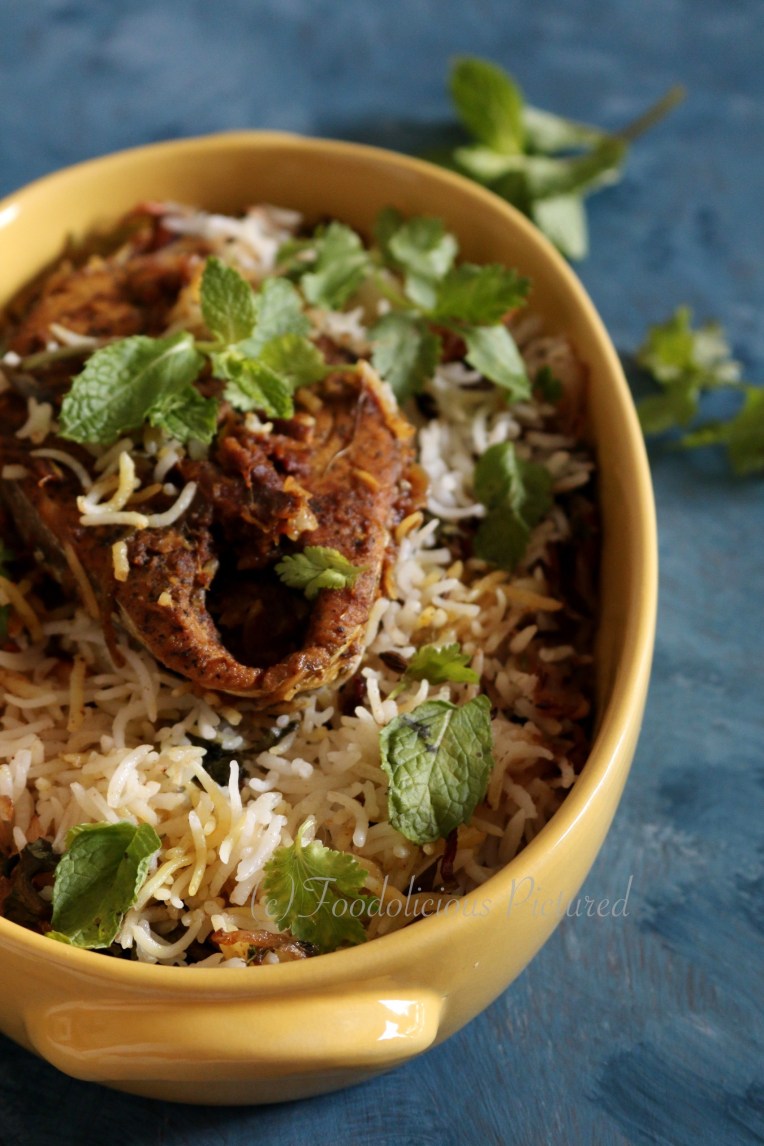 In a heavy bottom pan, spread some ghee, Layer a layer of half the rice and then the fish with gravy. Sprinkle some gram masala, chopped coriander leaves, chopped mint, fried nuts, raisins and onions. Layer the remaining rice and sprinkle some gram masala, chopped coriander leaves, chopped mint, fried nuts, raisins and onions.