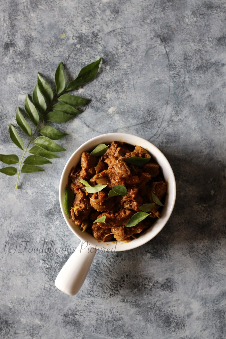 Marinate the cleaned mutton with all the ingredients under “For marination” , salt and set aside for 30-40 mins. Pressure cook the meat until done with just adding enough water.