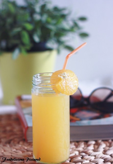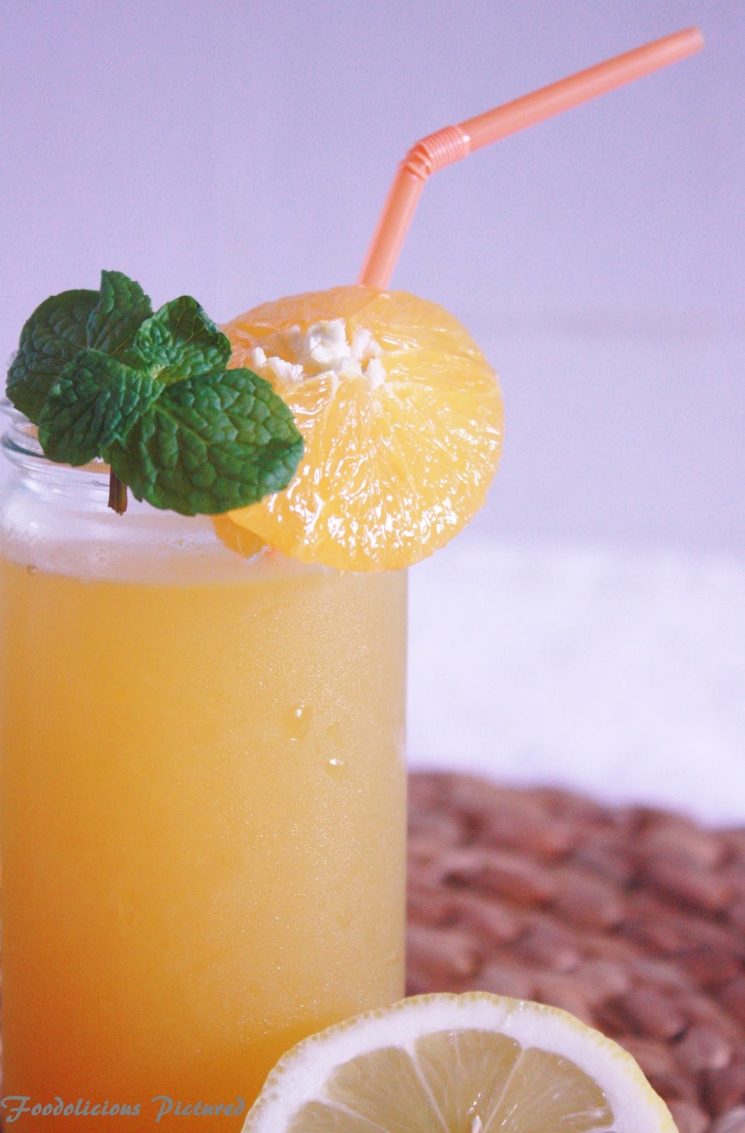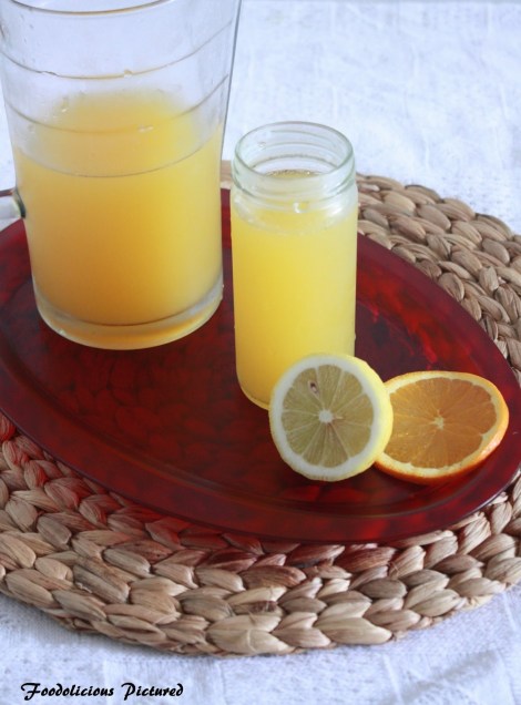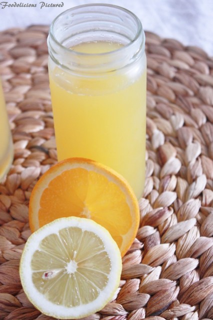 Mix the honey in the warm water. To this add in the orange juice, lemon juice and cold water and mix.