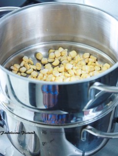 In a pan, bring the water turmeric and salt to rolling boil and add the rice. Cook till done. Once the rice is cooked. Keep it uncovered for a few minutes before you use a fork to fluff up the rice slowly. Set aside.