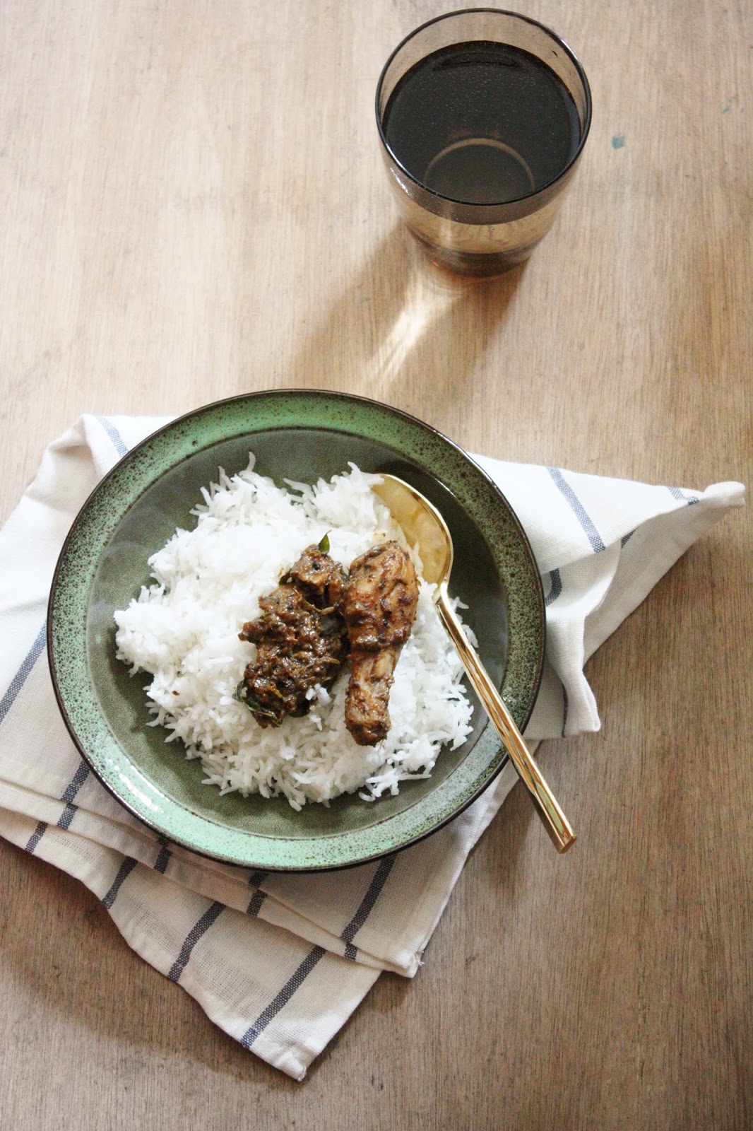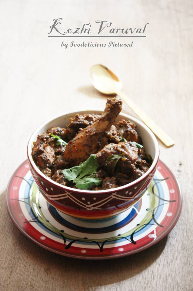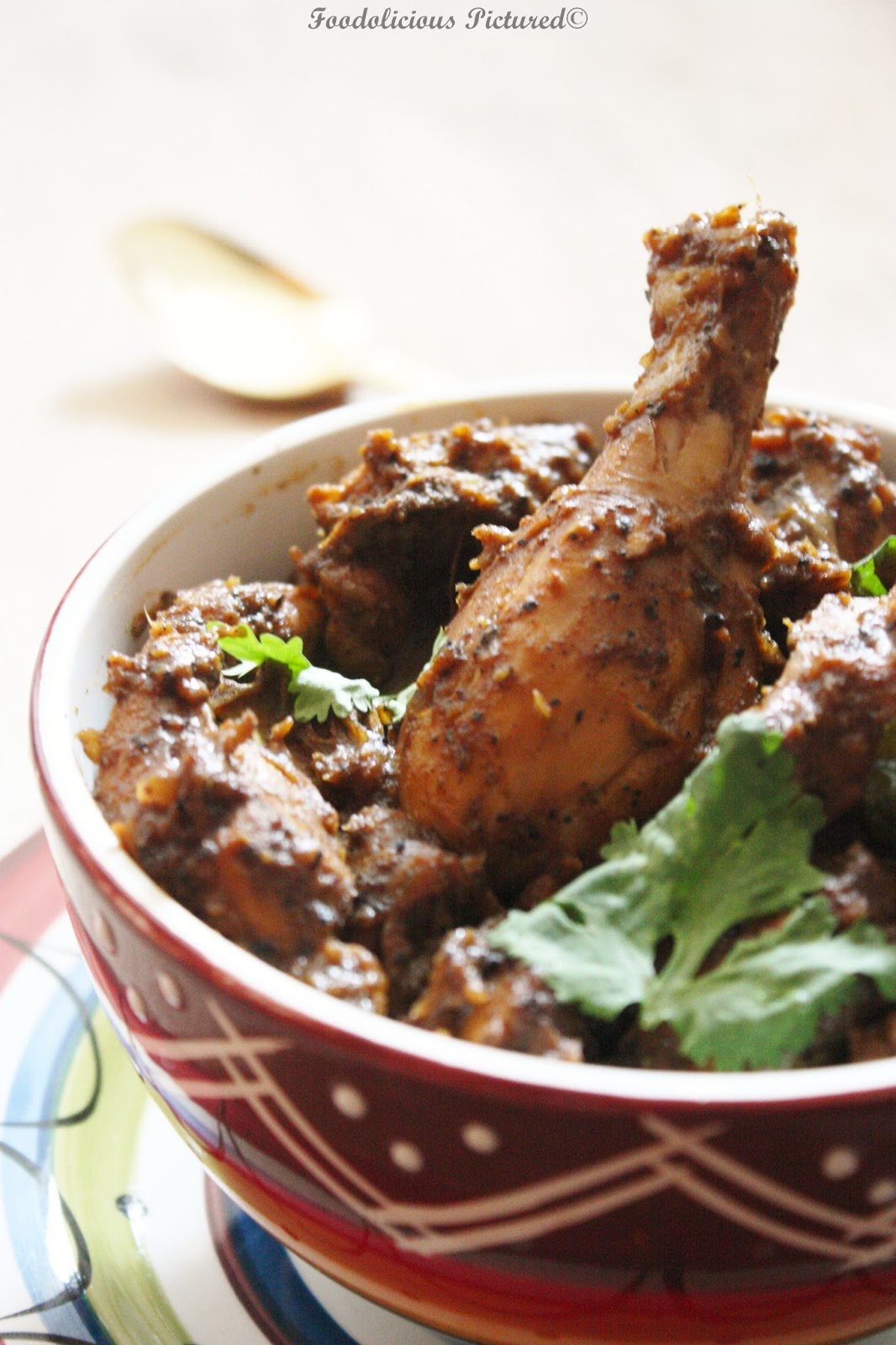 Add 2.5 teaspoons of ground pepper (reserve 1/2 teaspoon for the last) , coriander powder, turmeric powder, fennel powder and cook till the oil start to separate. Add the tomato paste (add a tablespoon of water if the mixture too dry), salt to taste and cook briefly for a few seconds. Add the chicken pieces and mix well to coat. Add about 1/4 cup water and curry leaves; cover and cook till done.