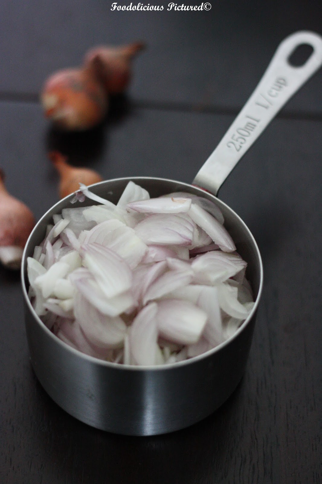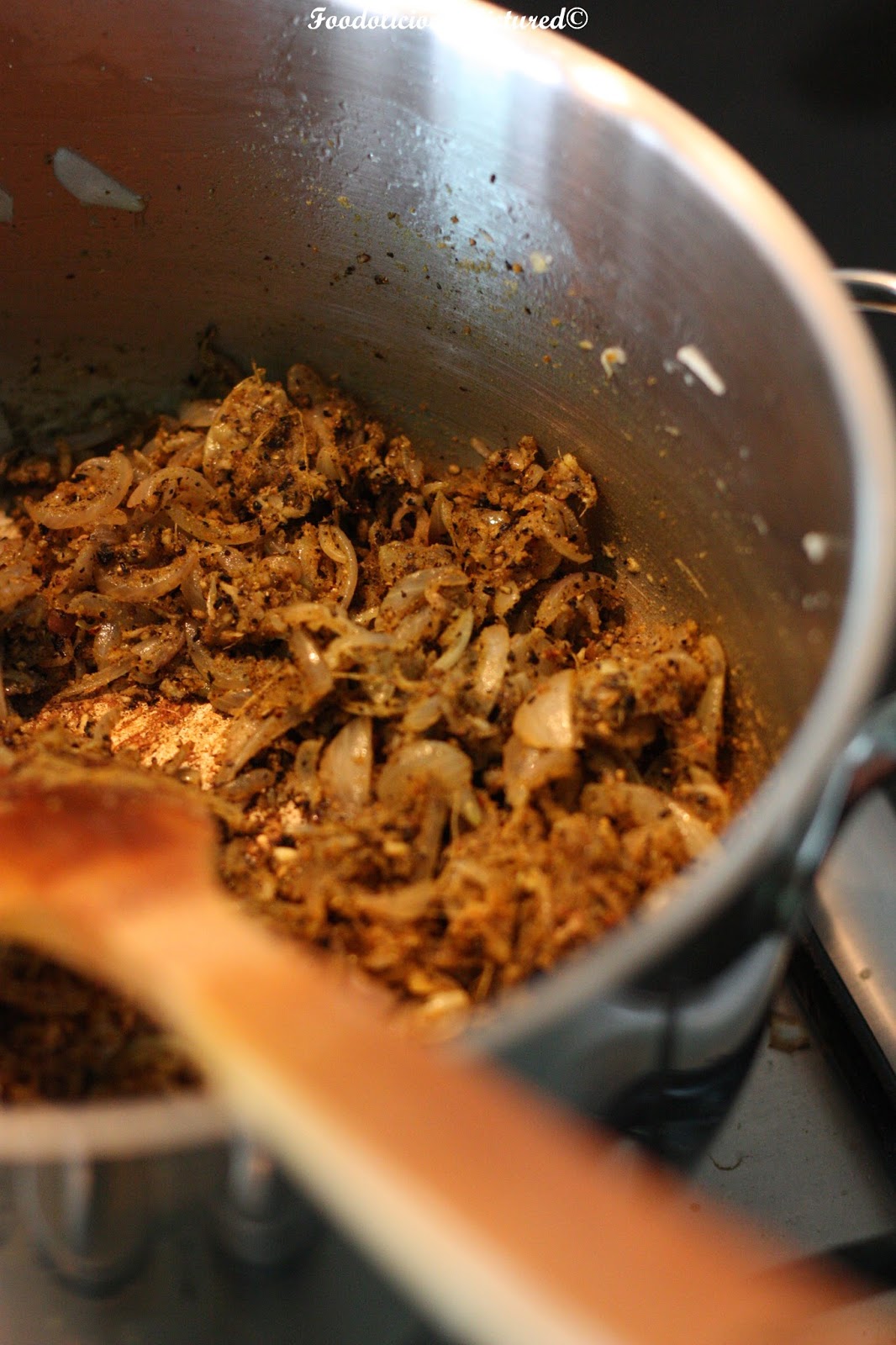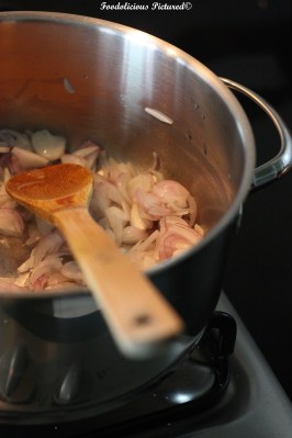 Heat oil in a pan and add the finely chopped shallots. Cook till translucent. Add in the ginger-garlic paste, green chili and continue to cook till the raw smell of ginger-garlic is gone and the onions turn golden brown.