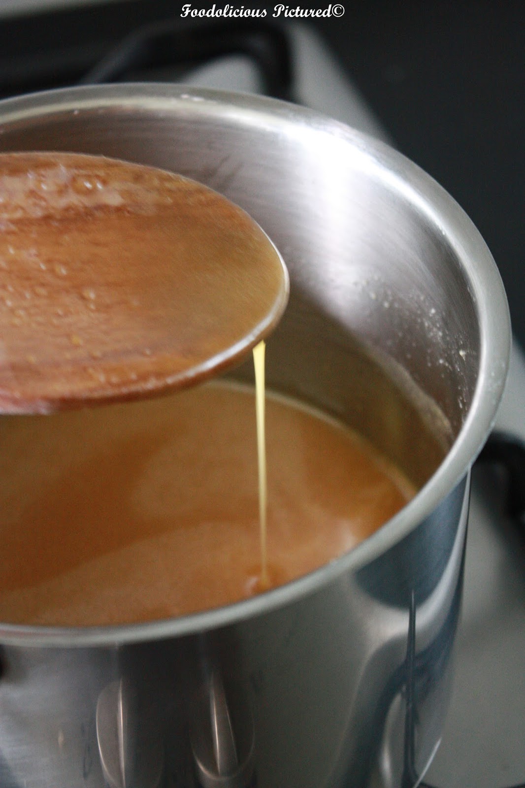 In pan melt the palm sugar/jaggery with 1/4 tablespoon water and aside. Now heat a heavy bottom pan and add 2 tablespoons of ghee. Add the cooked dal and melted jaggery and mix well. Be careful as the ghee will start to splatter so take care.