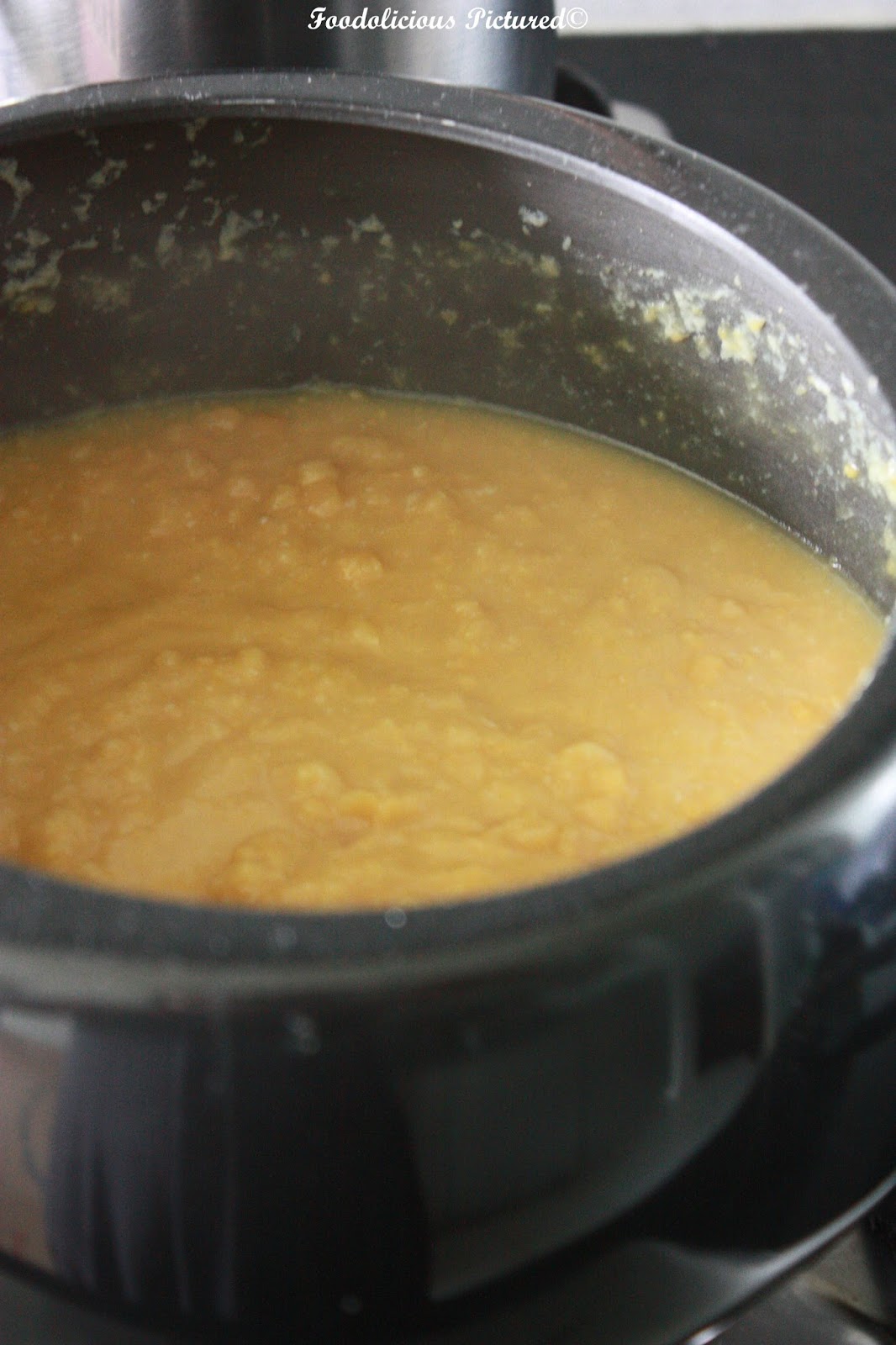 In pressure cooker, cook the dal with enough water (around 3 cups). Once done mash roughly and set aside.